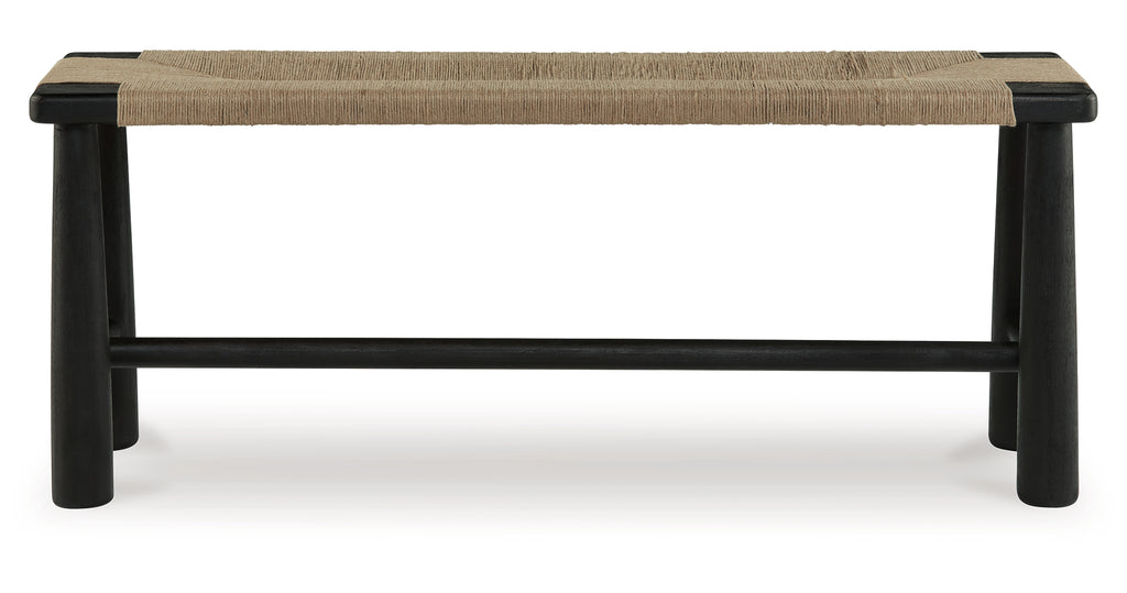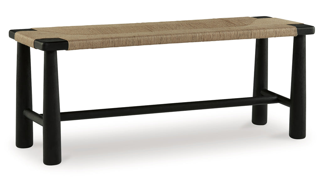 Understated style done beautifully well. The black wood frame and tapered post legs of this accent bench are a striking contrast with its handwoven natural jute upholstery. Combining a contemporary aesthetic with a mid-century vibe, it's ideal for a living room, an entryway or as the perfect seat beneath a window.