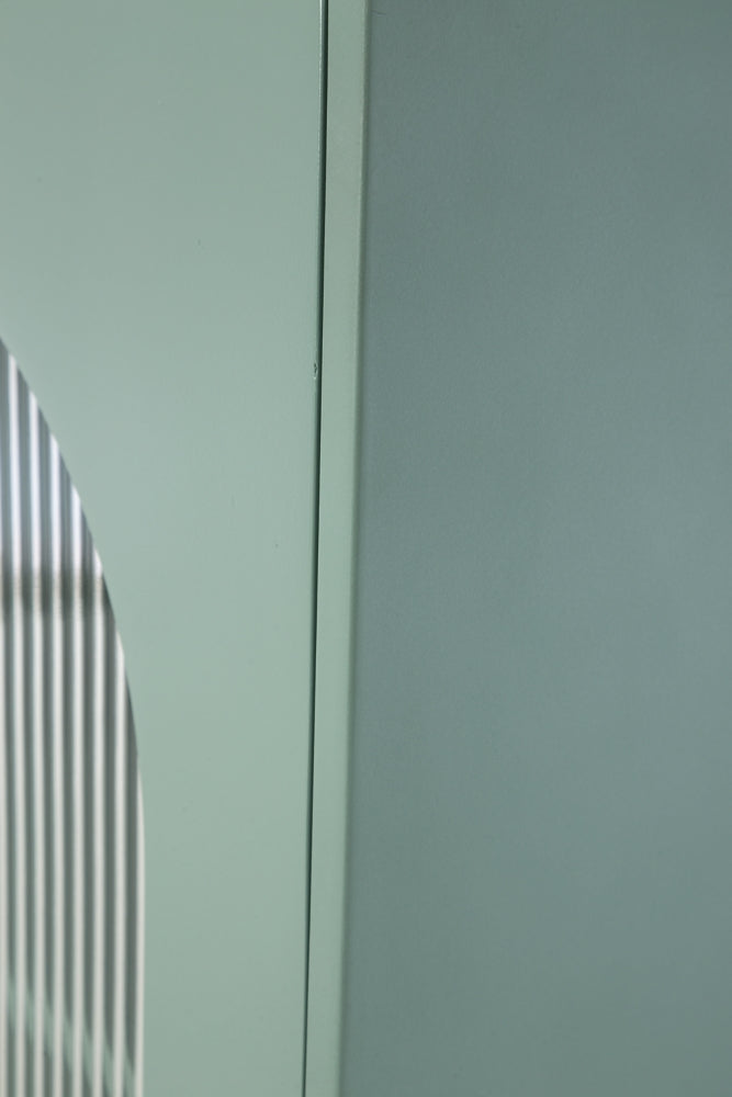 Clearly a stunning statement piece for lovers of contemporary design, this sleek accent cabinet wows on many levels. Magnificent arched fluted glass door panels and goldtone metal hardware exude serious modern flair. And how about that fresh green finish? Two shelves add practicality to the cabinet's striking style.