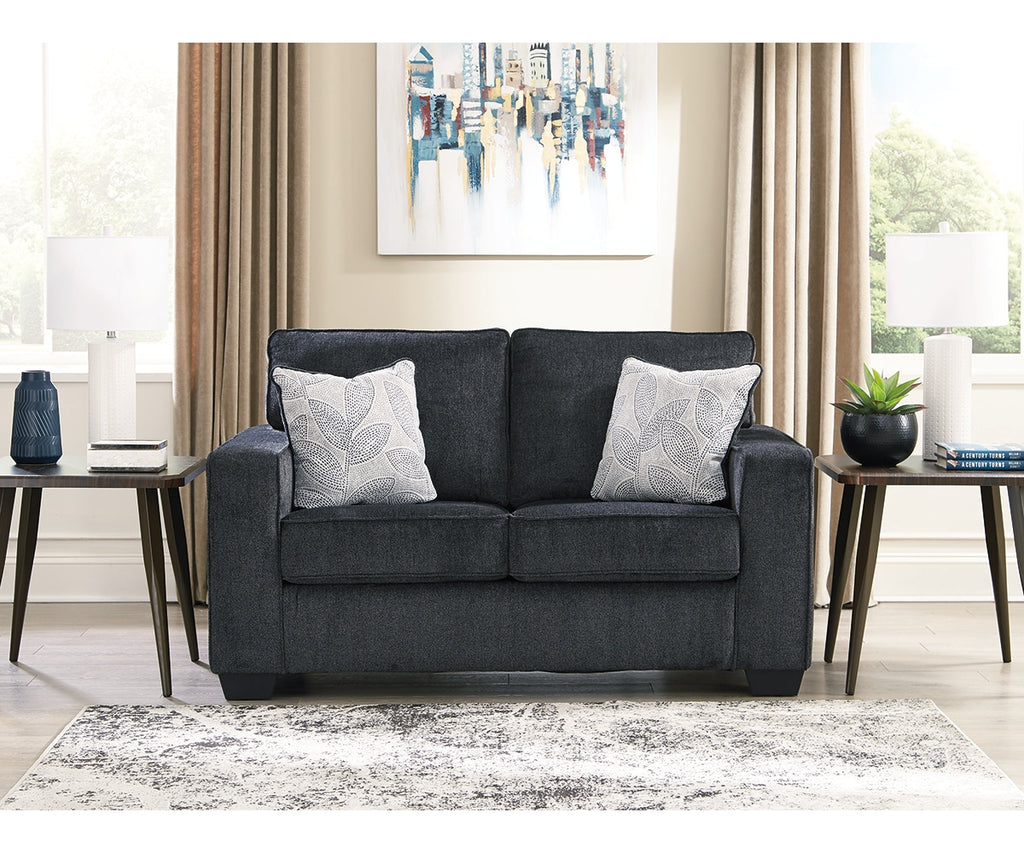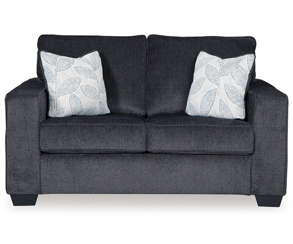If style is the question, then this loveseat is the answer. Sporting clean lines and sleek track arms, the decidedly contemporary profile is enhanced with plump cushioning and a chenille-feel upholstery that's so pleasing to the touch. Sure to play well with so many color schemes, this loveseat in slate gray includes a pair of understated floral pattern pillows for fashionably fresh appeal.