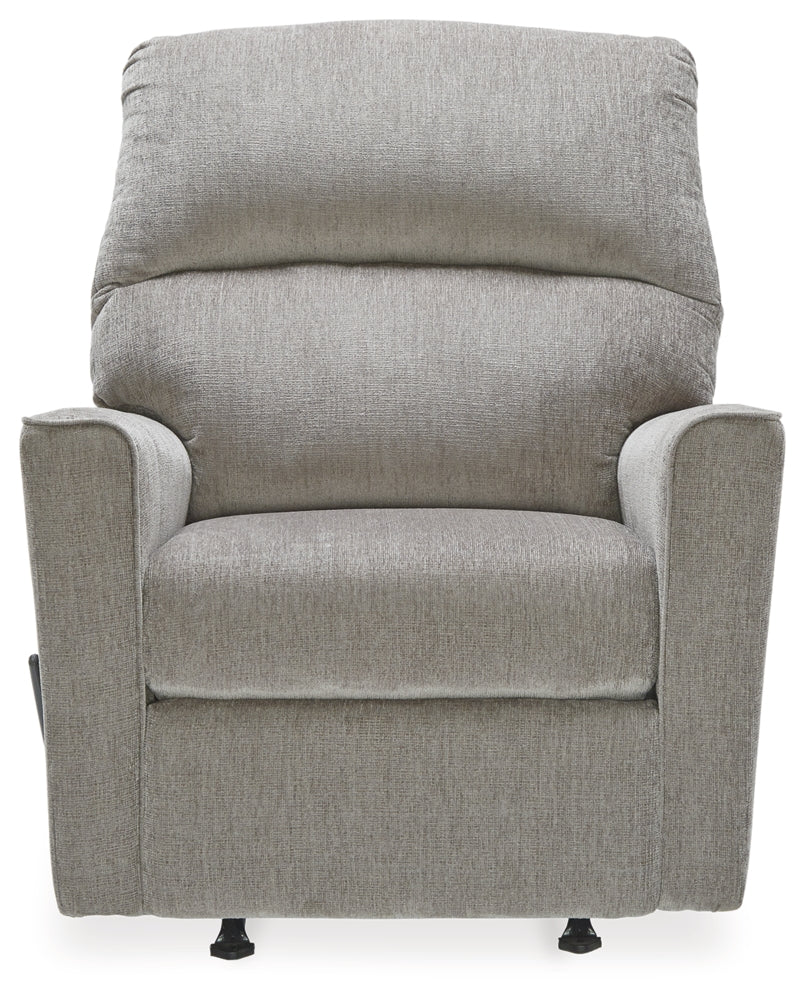 If style is the question, then this rocker recliner is the answer. Clean-lined profile is beautifully contemporary. Plush chenille fabric and plump cushioning make it so easy to comfortably kick up your heels. Richly neutral hue complements a variety of decor.