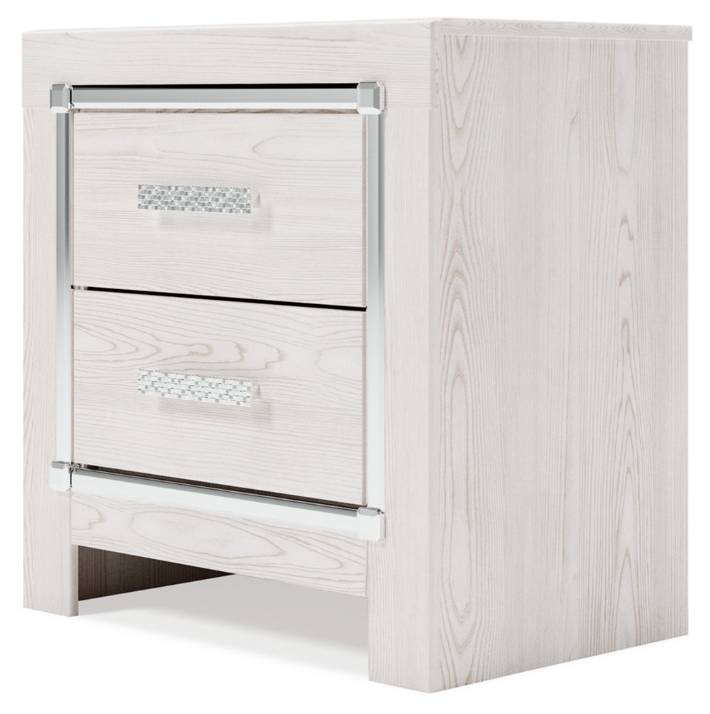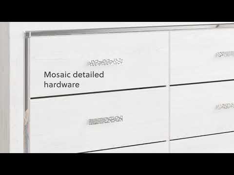The epitome of fashion-forward design, this nightstand is a beautiful blend of comfort and luxury. Shiny chrome-tone accents, a pearlized finish and mosaic pulls bring a glam touch to the richly rustic appearance. With wireless and plug-in charging options, this bedside table adds style and modern conveniences to your restful retreat.