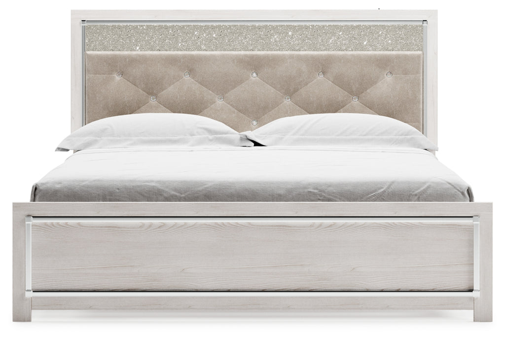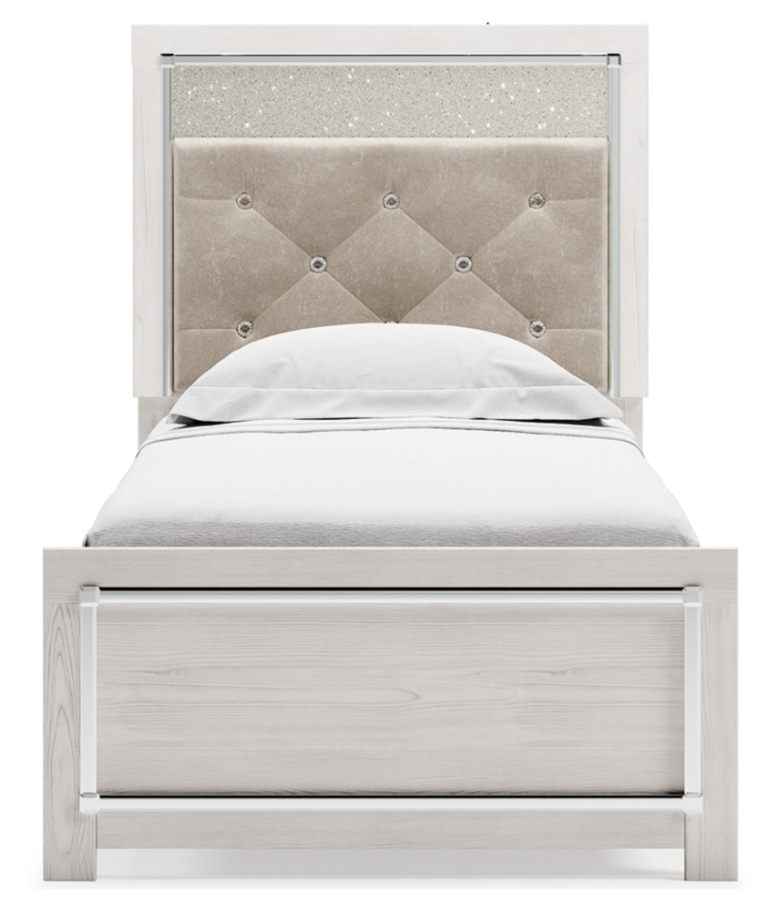 The epitome of fashion-forward design, this twin panel bed is a beautiful blend of comfort and luxury. Shiny chrome-tone accents, a pearlized finish and button-tufted upholstery bring a glam touch to the richly rustic appearance. Remote-controlled LED lighting adds style and modern conveniences to your restful retreat.