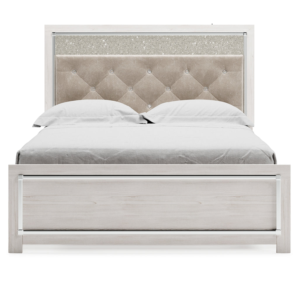 The epitome of fashion-forward design, this queen panel platform bed is a beautiful blend of comfort and luxury. Shiny chrome-tone accents, a pearlized finish and button-tufted upholstery bring a glam touch to the richly rustic appearance. Remote-controlled LED lighting adds style and modern convenience to your restful retreat.