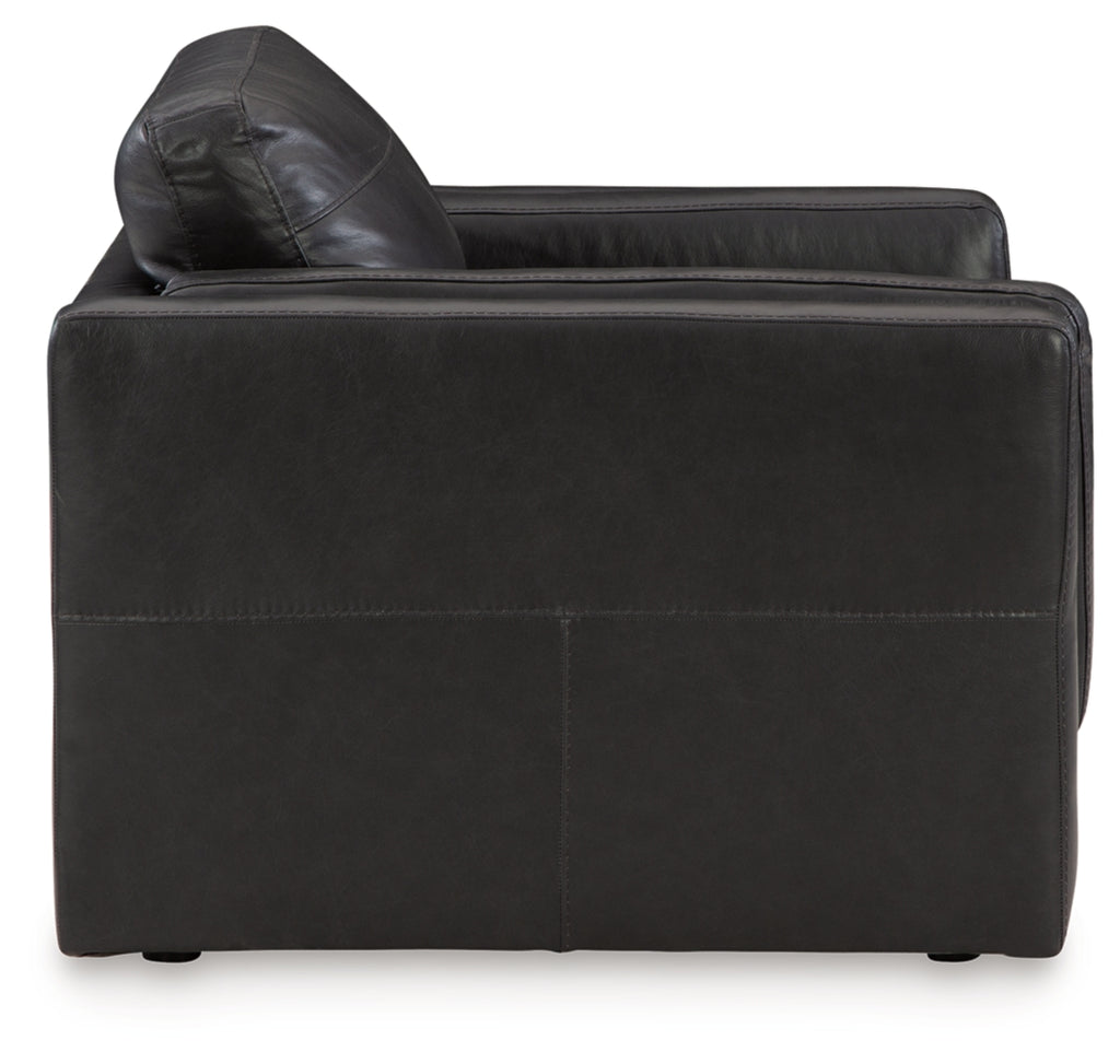 Keen on crisp, contemporary design? Adore the pleasure of leather? Look no further. This oversized chair satisfies on every level. Richly textured and decadently supple, the plush cushions are wrapped with expertly matched leather and faux leather upholstery in an on-trend onyx tone. Sleek double-padded arms and a low, clean-lined profile complete the chair's simply chic appeal.