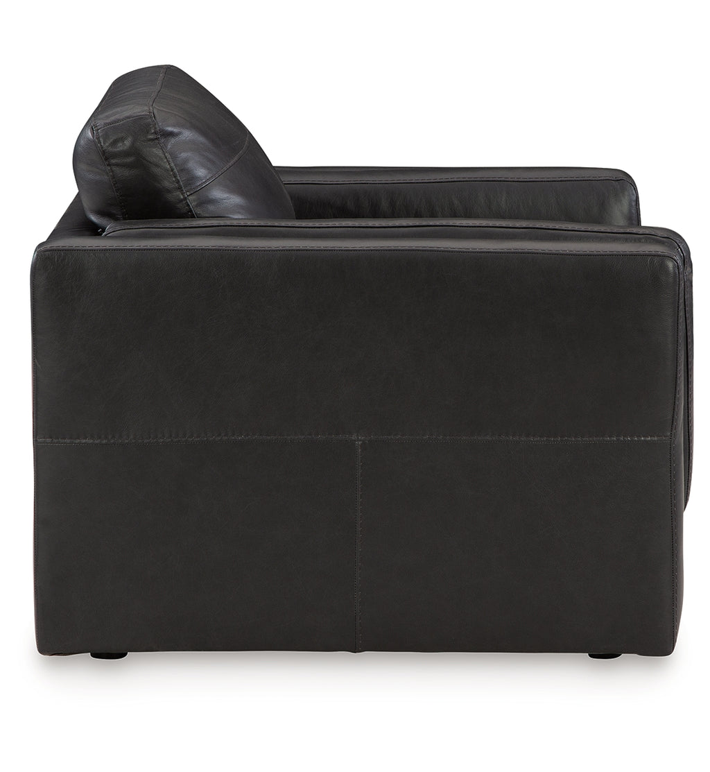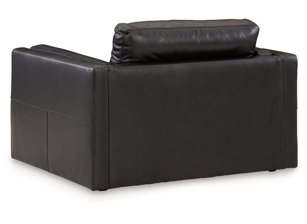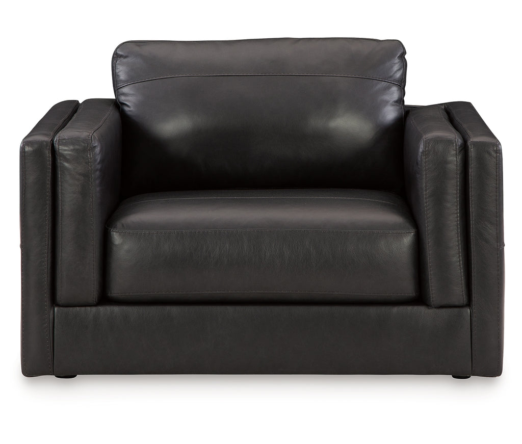 Keen on crisp, contemporary design? Adore the pleasure of leather? Look no further. This oversized chair satisfies on every level. Richly textured and decadently supple, the plush cushions are wrapped with combination leather and faux leather upholstery in an on-trend onyx tone. Sleek double-padded arms and a low, clean-lined profile complete the chair's simply chic appeal.