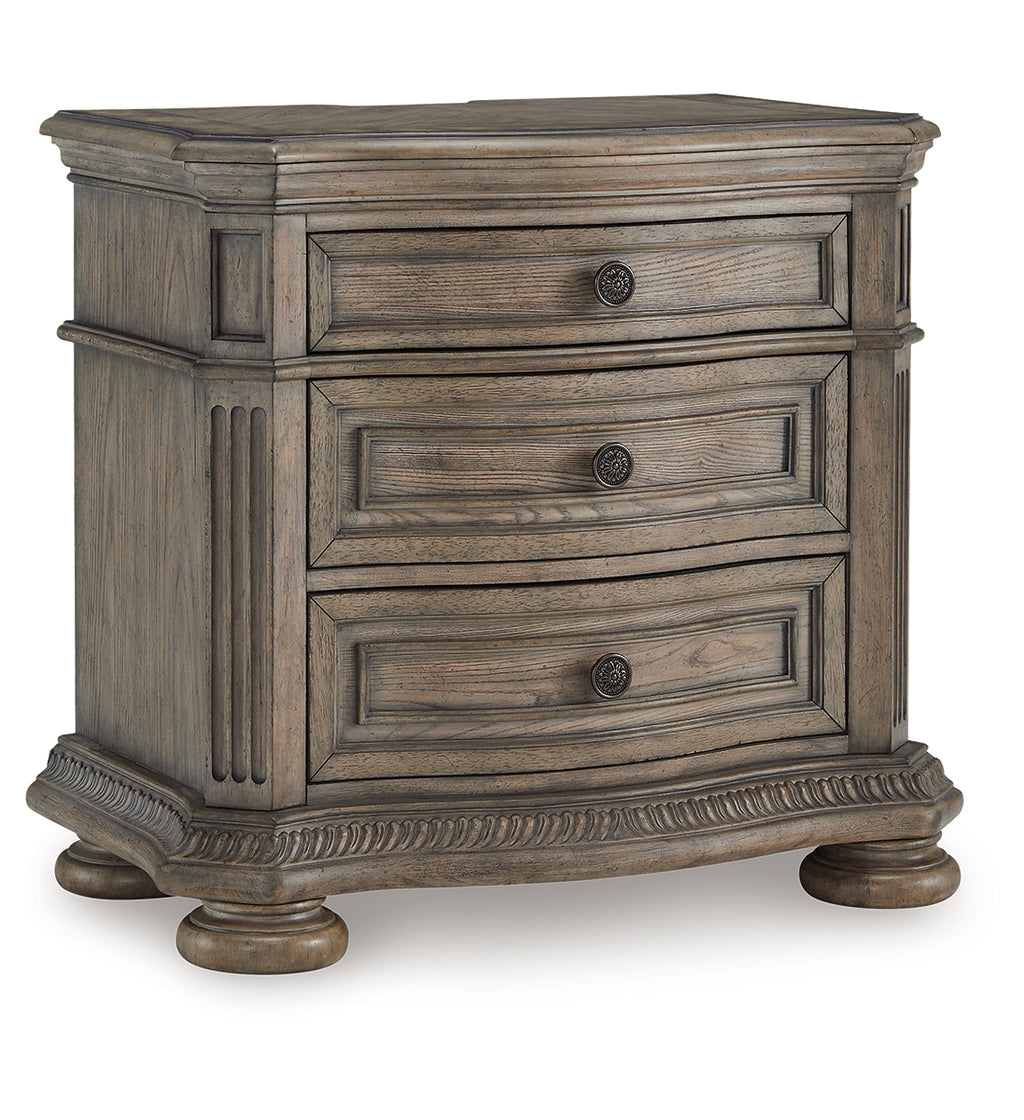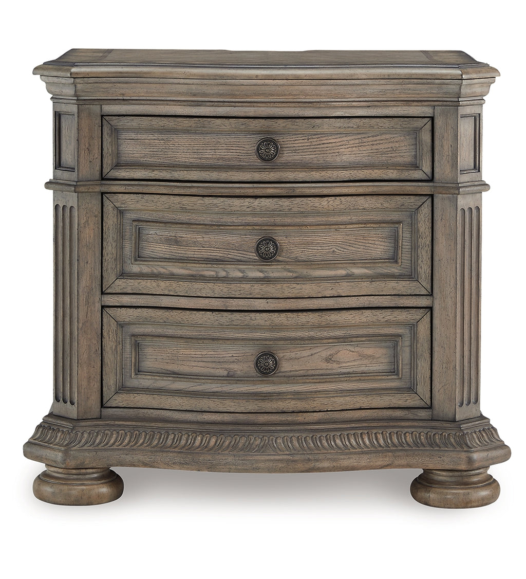 Merging traditional elegance with contemporary comfort, this nightstand takes your bedroom retreat to the next level. Serpentine curves, ash swirl veneer inlays on the top and a glazed antiqued-look finish radiate timeless sophistication. Drawers are packed with ample bedside storage possibilities. A convenient 110V power supply and USB charging add a modern touch to this stunningly refined piece.