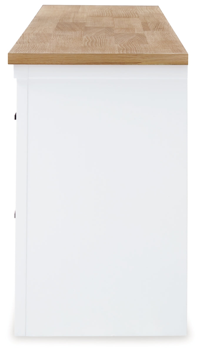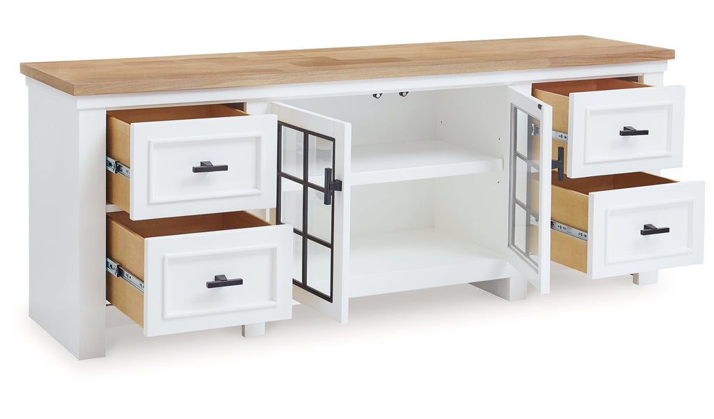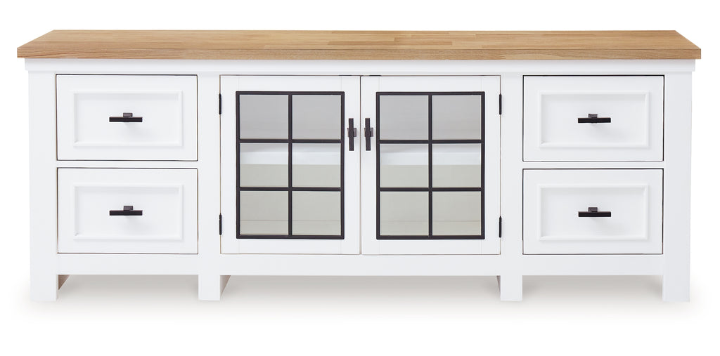 Casual style with substance. This two-tone TV stand raises the bar on comfortably cozy design. A sturdy silhouette with a butcher block oak veneer top, classic white finish and contemporary black metal hardware exude modern farmhouse vibes. Spacious cabinets, display shelves and drawers let you tuck away entertainment essentials while displaying treasures in this charmingly curated piece. Cutouts for wire management help keep the look relaxed and uncluttered.