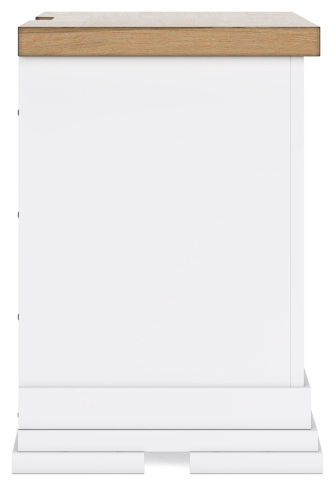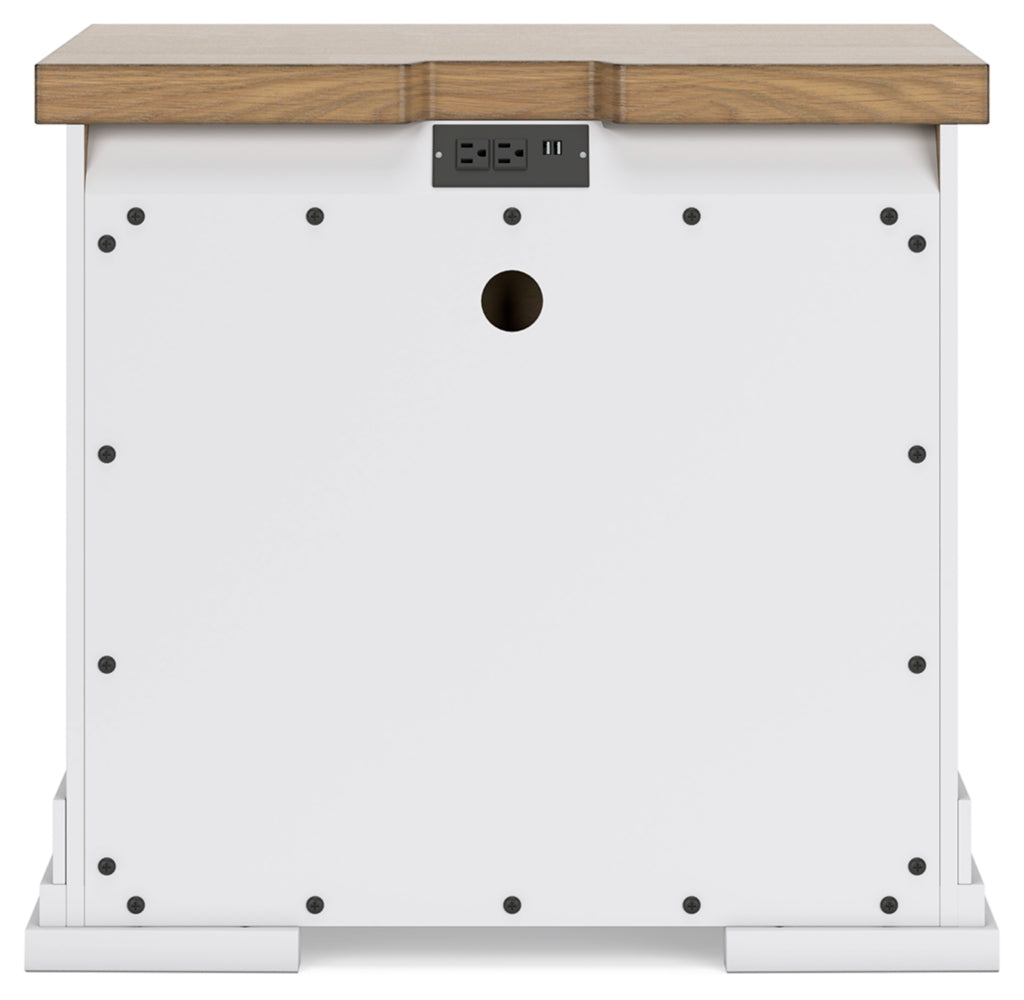 Casual style with substance. This two-tone nightstand raises the bar on comfortably cozy design in your soothing sanctuary. A sturdy silhouette with a classic white finish and black metal hardware exudes modern farmhouse vibes. The butcher block oak veneer top adds a relaxed aesthetic. And bedside charging for your go-to devices is made easy with power outlets and USB ports.