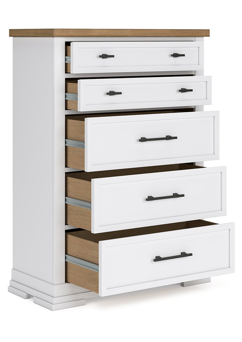 • 5 spacious drawers with fully finished interiors (top drawers felt lined), dovetail construction and ball-bearing side glides