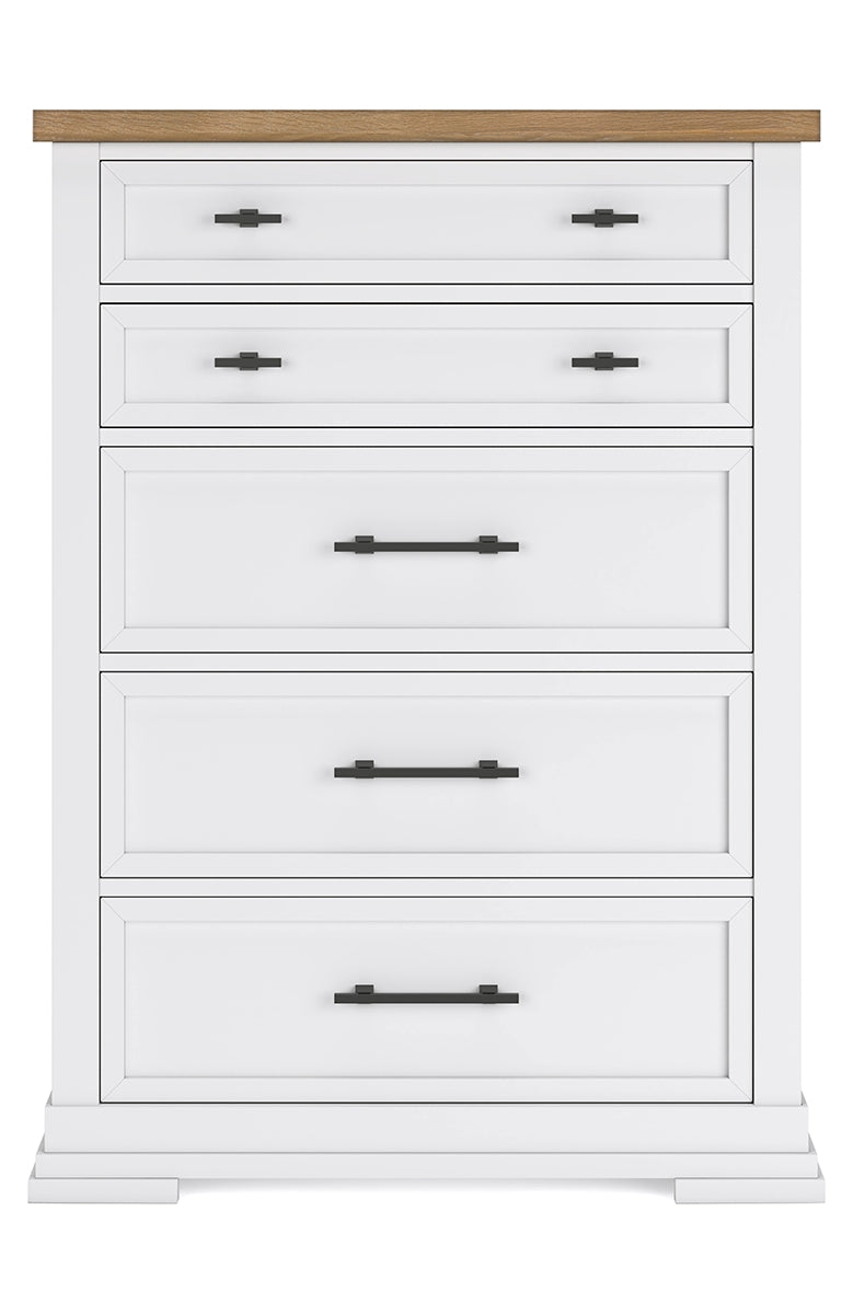 Casual style with substance. This two-tone bedroom package raises the bar on comfortably cozy design in your soothing sanctuary. Charmingly curated, its sturdy silhouettes and black metal details exude modern farmhouse vibes.