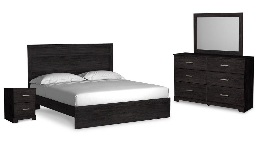 • Includes king panel bed (headboard, footboard and rails), 2-drawer nightstand and 6-drawer dresser with mirror