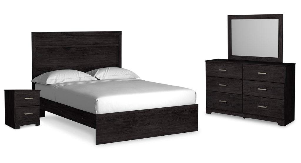 • Includes queen panel bed (headboard, footboard and rails), 2-drawer nightstand and 6-drawer dresser with mirror