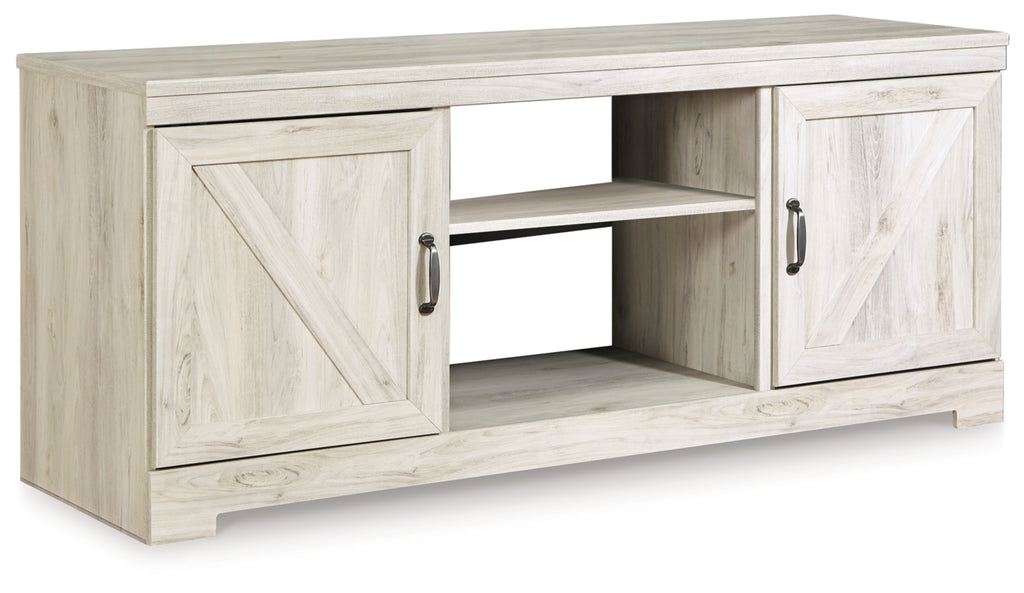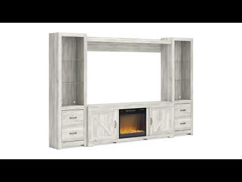Express your farmhouse style with this TV stand with fireplace insert. Its wispy white finish over replicated oak wood grain is a delightful change from the ordinary. Clean-lined, classic styling with barn door inspiration provides a country chic aesthetic that’s a breath of fresh air. Adding that much more show-stopping style, the electric fireplace insert operates with or without heat and includes a six-level temperature setting, a remote control and an overheating control for added safety. It comes with faux glass crystals and natural stones, so you can customize the look of the flame bed.