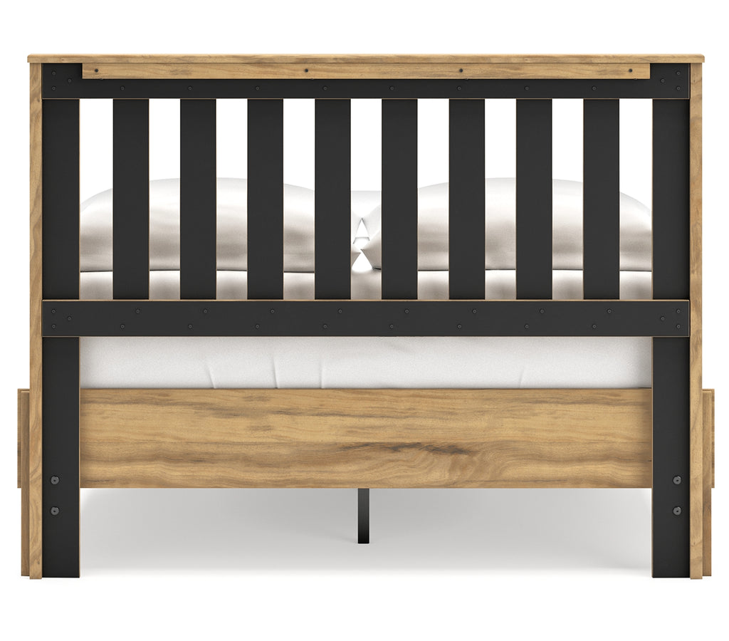 This full platform panel bed puts the dream of a casual bedroom retreat beautifully within budget. Its warm light brown finish over replicated hickory grain exudes a homey vibe. Slatted detailing on the headboard incorporates rich dimension. It’s a simply relaxed way to achieve the bedroom of your dreams without needing a foundation or box spring.
