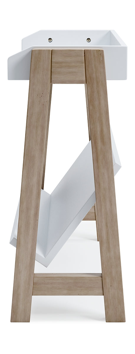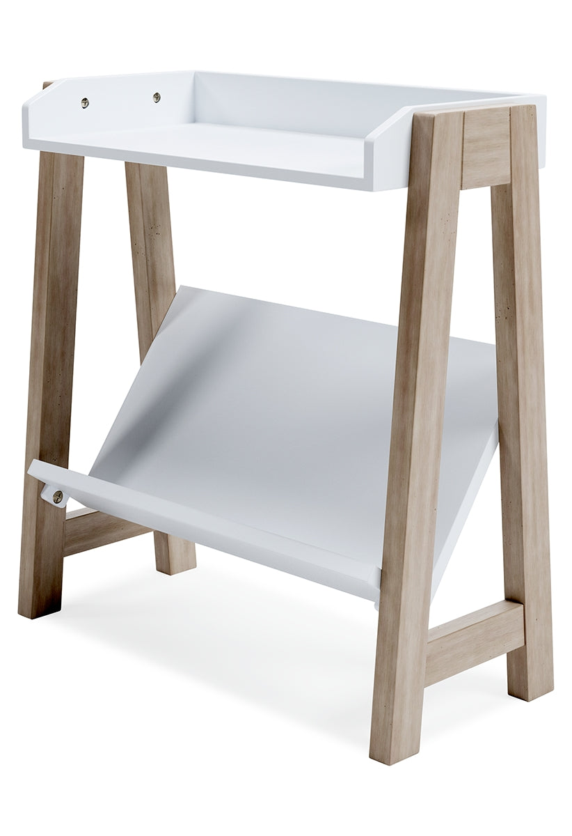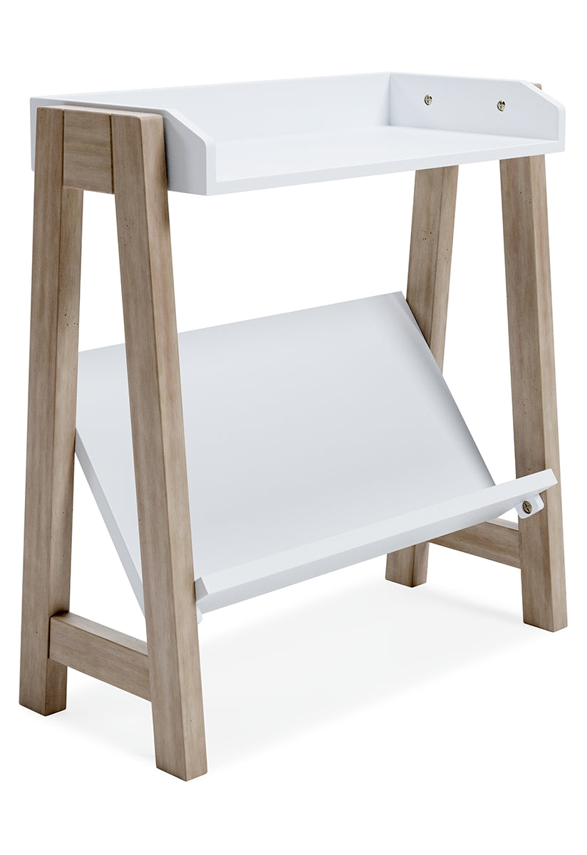 Whether for storage or display, this stylish small bookcase provides the perfect place to prop their ever-expanding book collection. The unique angled lower shelf and gallery rail top in white charmingly contrast with the light tan frame, creating a versatile piece ideal for small spaces.