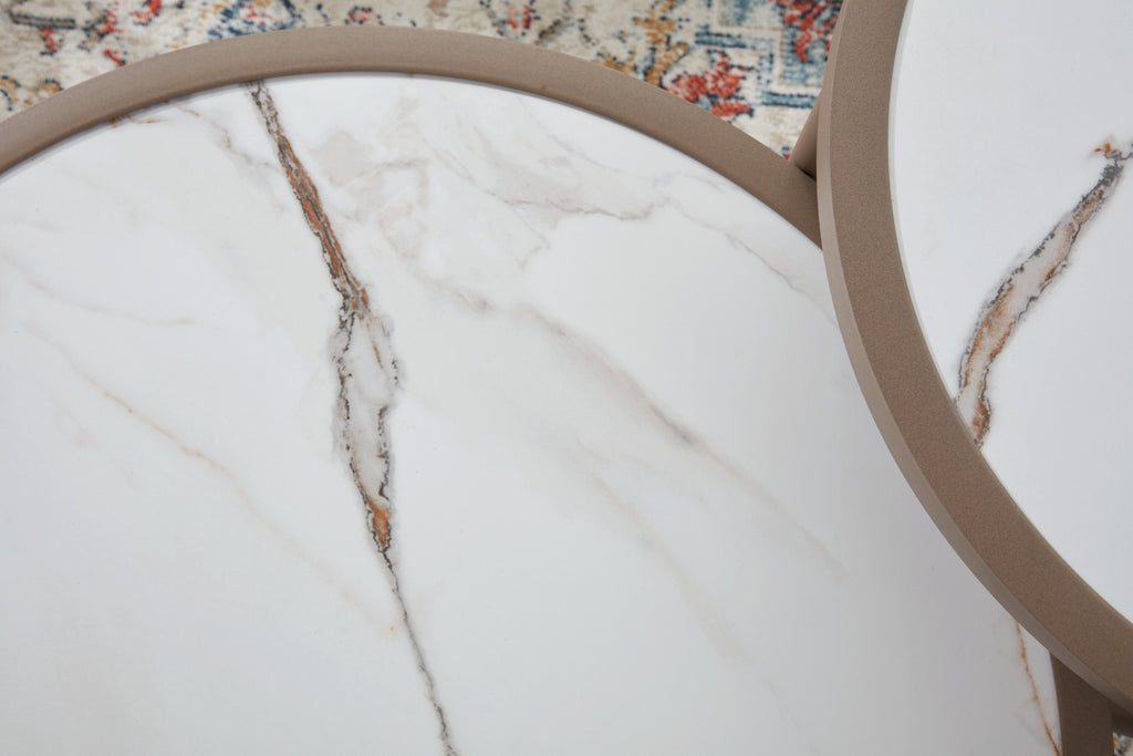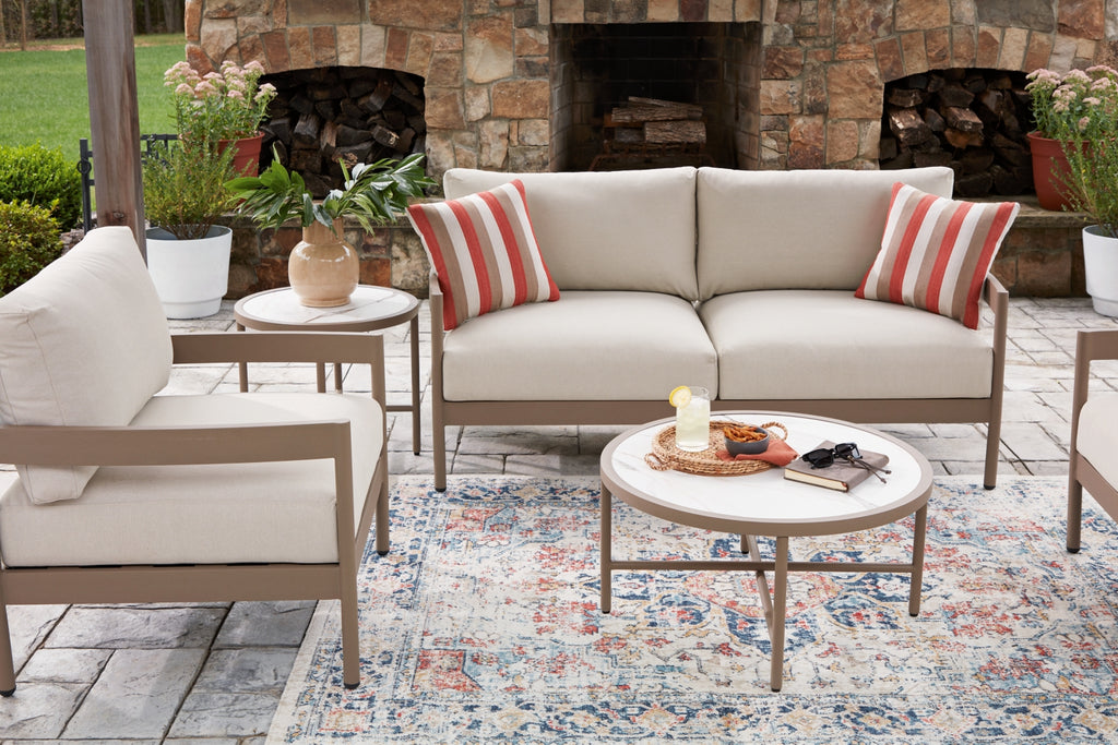 Indulgently comfortable furniture shouldn't be limited to inside spaces. Create your own outdoor oasis with this 5-piece outdoor ensemble. It's a study in form and function, with clean-lined, durable aluminum frames that are ready for many seasons of fun in the sun. Plush lounge chair and loveseat cushions wrapped in high-performing Nuvella® fabric are comfortable and carefree, while sintered stone tabletops lend an air of natural elegance.