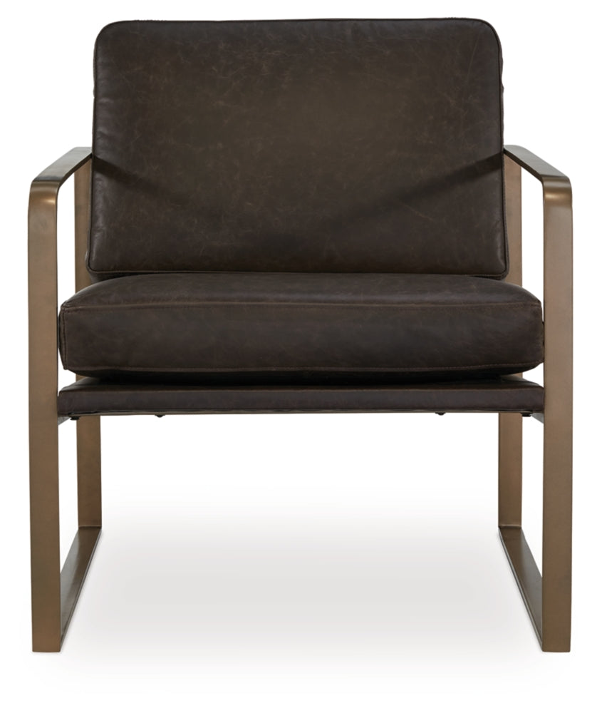 Wowing with supple dark brown leather and a metal frame in a soft goldtone, this accent chair brings an element of modern sophistication. An ultra-cool base gives so much urban industrial appeal.