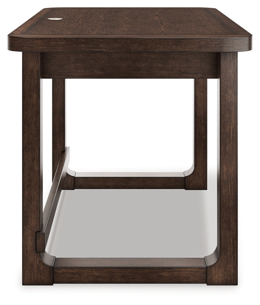 Classic meets contemporary in this home office desk. Its rich, dark wood tone and rounded corners suit today’s trends while balancing a timeless appeal. And with two storage drawers for work and study essentials, this desk gives your office a dose of both form and function.