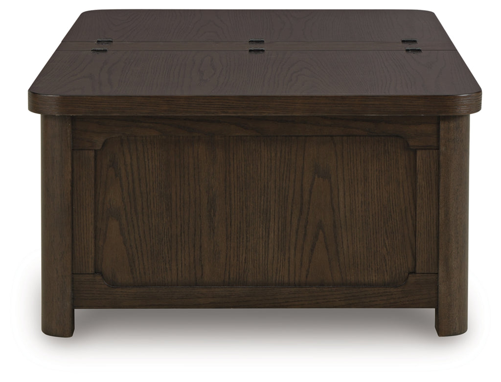 If casual contemporary style is your thing, then you'll love this coffee table with storage. Its thick tabletop, softly rounded corners and rich wood-tone finish lend a soothing sensibility. A deep trunk cabinet offers plenty of room to store extra pillows, blankets and anything else you want to tuck out of sight. Sleek and smart, this piece is a fresh take on cool for the modern home.