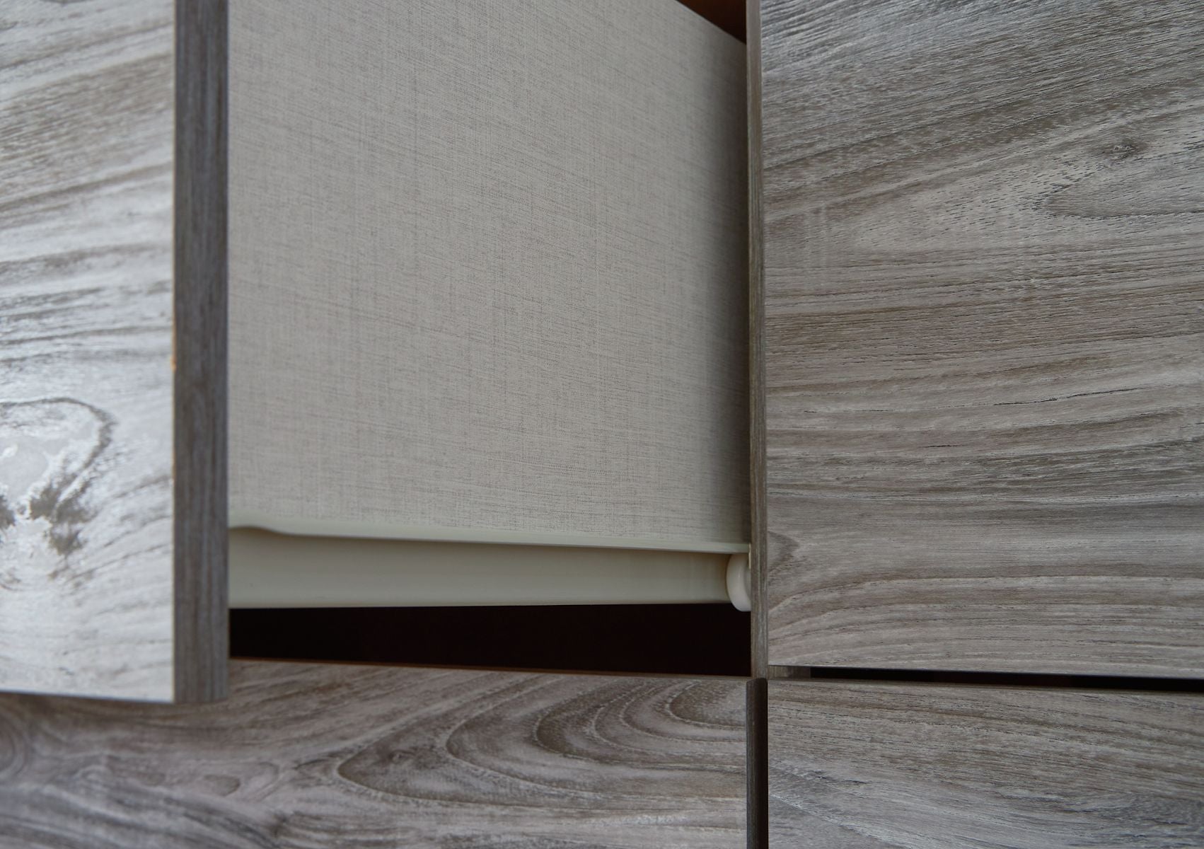 • Drawer interiors are lined with a faux linen laminate for a clean, finished look