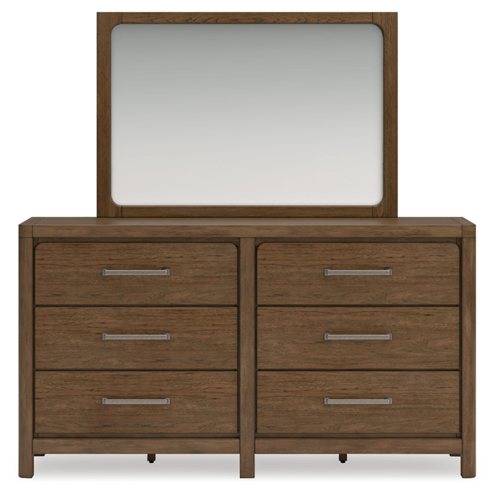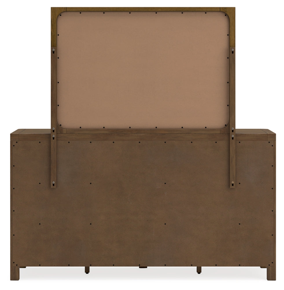 This dresser with mirror sits comfortably at the intersection of modern lodge and farmhouse aesthetics. Your warm and welcoming disposition is reflected in the charming architectural elements and light brown glazed finish. Even with its poise, the piece remains practical. Smooth-gliding drawers tuck away necessities, defining your bedroom with reliable function and style.