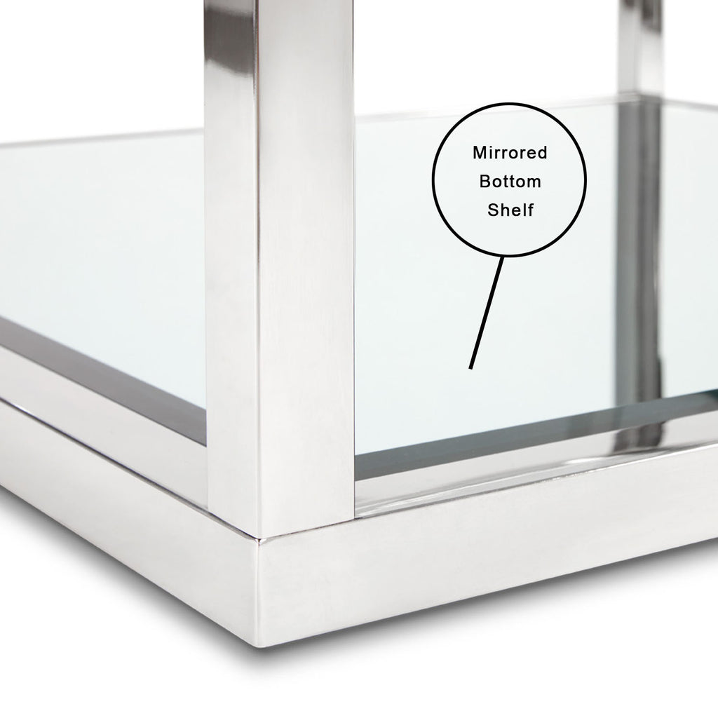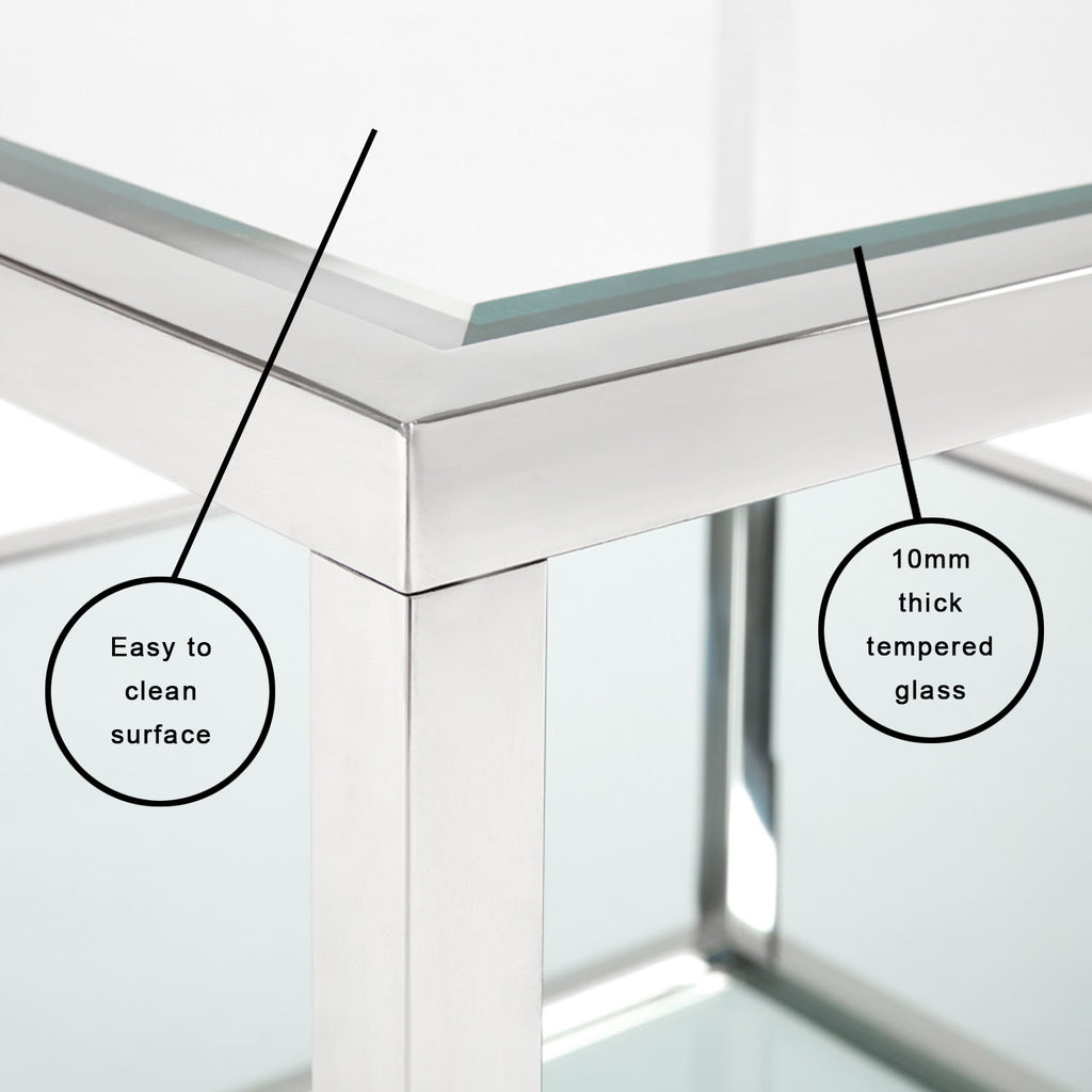 Elevate your living space with the Caspian Contemporary Square Coffee Table. Boasting a sleek tempered glass top paired with a polished steel frame, this table is the epitome of modern elegance. Its spacious design ensures ample room for your favorite books, decor, or refreshments, making it both stylish and functional. Perfect for any modern home, it adds a touch of sophistication and luxury. Dive into a world of contemporary style with Caspian!