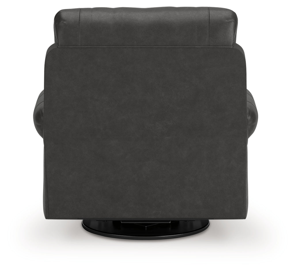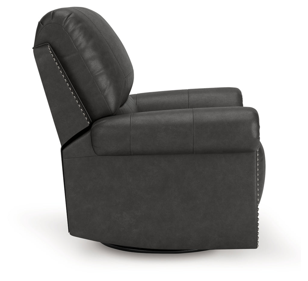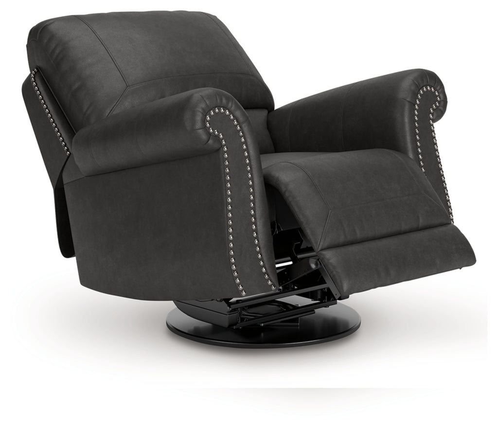 Everyone can have the best seat in the house with this swivel glider recliner. Its nailhead trim puts the finishing touches on the traditional roll arms you love. The recliner's comfy, durable cushions—wrapped in a rustic yet sophisticated faux leather—keep you feeling relaxed, while its turned legs show that style and quality flow from top to bottom. Plus the smooth reclining motion and 360-degree swivel keep you in the flow of conversation.
