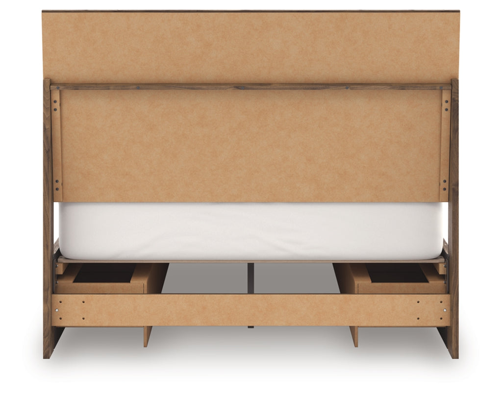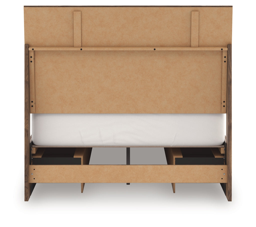 Nostalgic style, retooled for today’s trends. This king panel bed with storage puts an elevated twist on mod aesthetics. Its warm brown tones reflect the mid-century vibes you love, while the simple panel design incorporates contemporary motifs. Ultra-spacious storage in the footboard keeps clutter out of sight. Integrated drawer handles round out the look in sleek style. With this bed, you can build your bedroom into a modern haven with a touch of retro-cool flair.