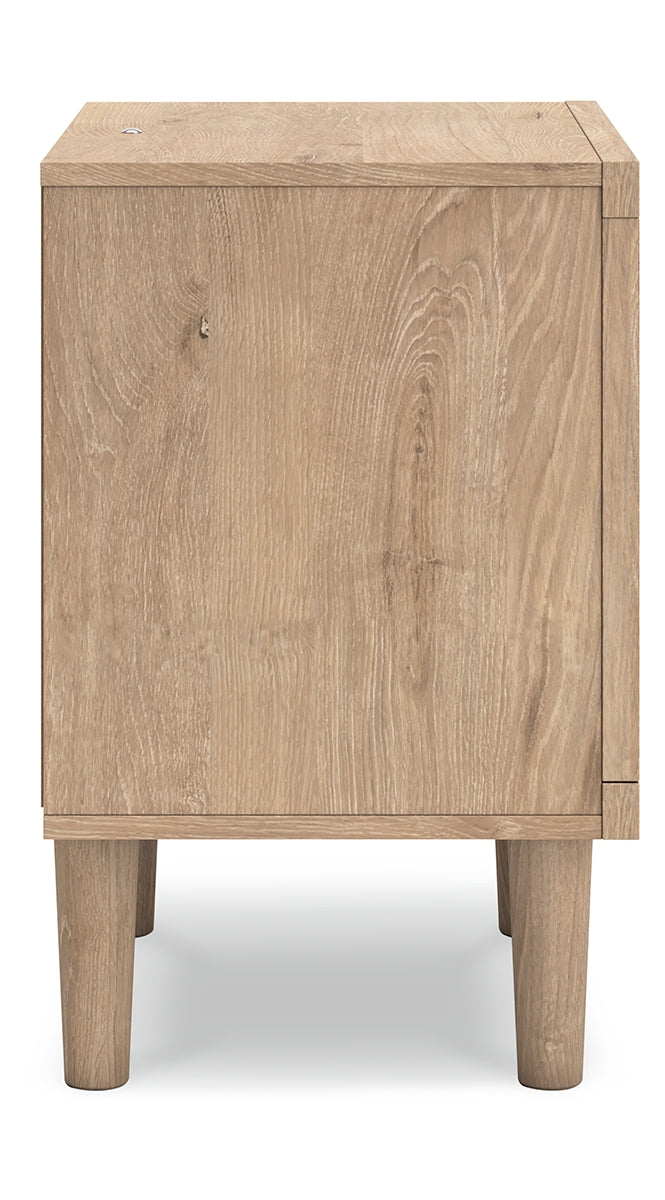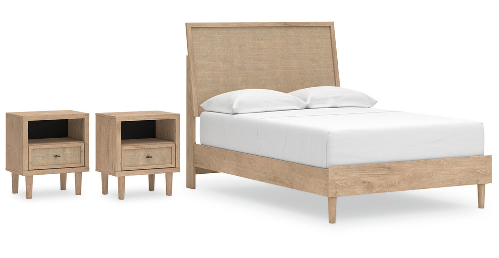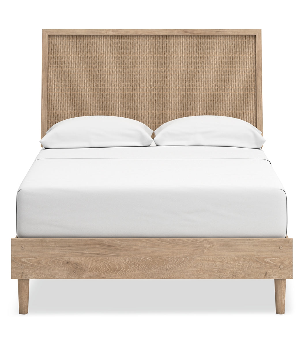 Clean-lined and contemporary—but far from stark—this bedroom package is a fresh style awakening. Pairing a light finish with replicated oak grain and textured beige cane details, its mixed materials bring a naturally versatile vibe to your bedroom. Sleek, simple hardware plays perfectly with the modern aesthetic.