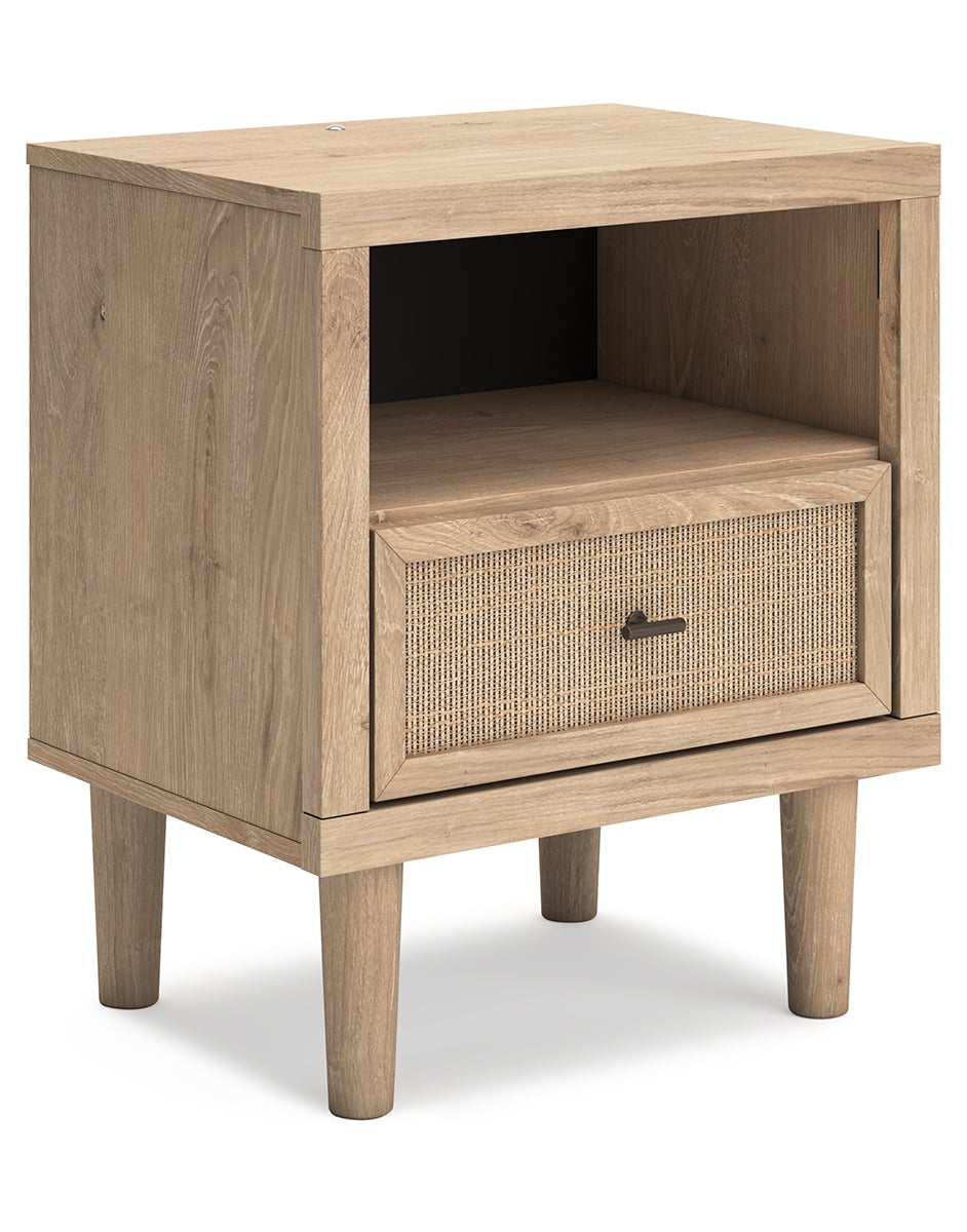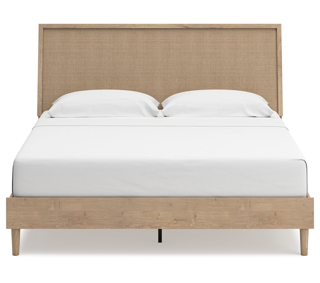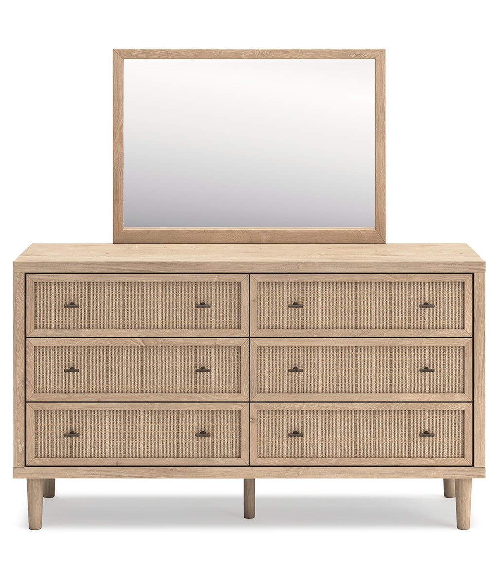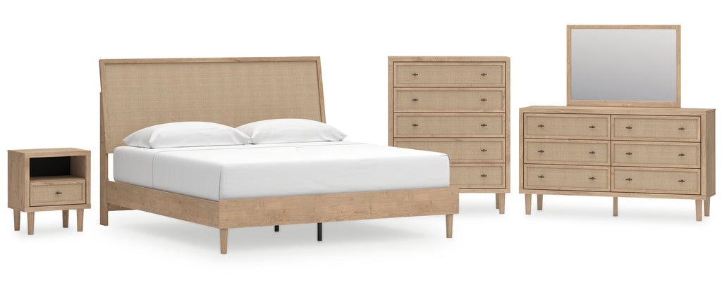 Clean-lined and contemporary—but far from stark—this bedroom package is a fresh style awakening. Pairing a light finish with replicated oak grain and textured beige cane details, its mixed materials bring a naturally versatile vibe to your bedroom. Sleek, simple hardware plays perfectly with the modern aesthetic.