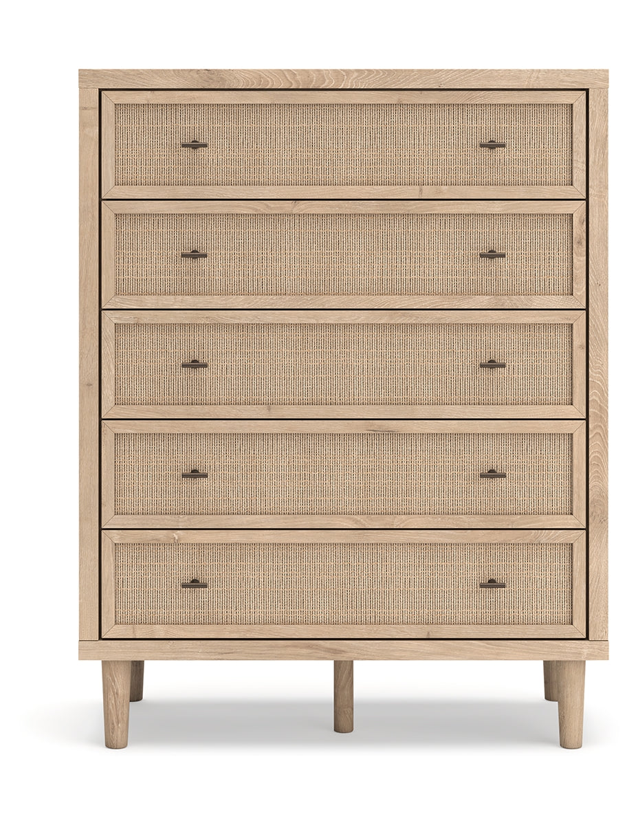 • Framed drawer fronts with textured beige finish that replicates the look of cane