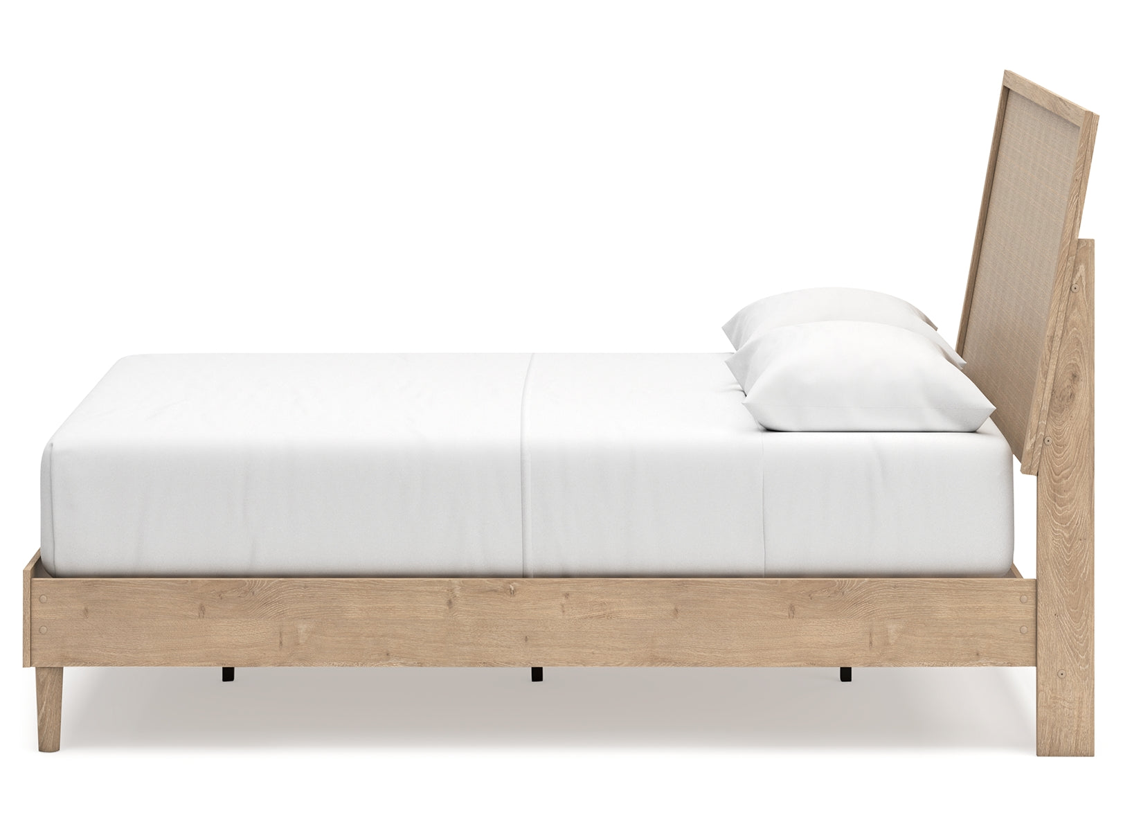 Clean-lined and contemporary—but far from stark—this queen panel bed is a fresh style awakening. Pairing a light finish with replicated oak grain and textured beige cane details, its mixed materials bring a naturally versatile vibe to your bedroom. Talk about style with added dimension. Its simplicity plays perfectly with the modern aesthetic and calming mood you long for in your tranquil retreat.