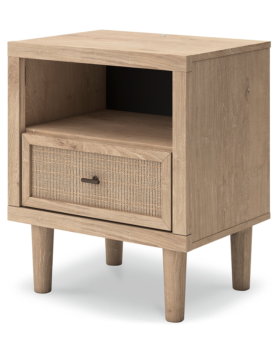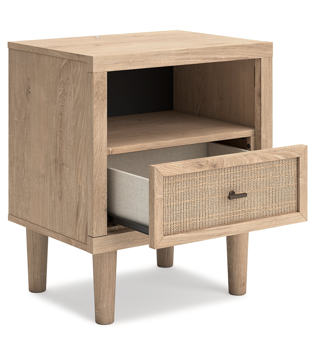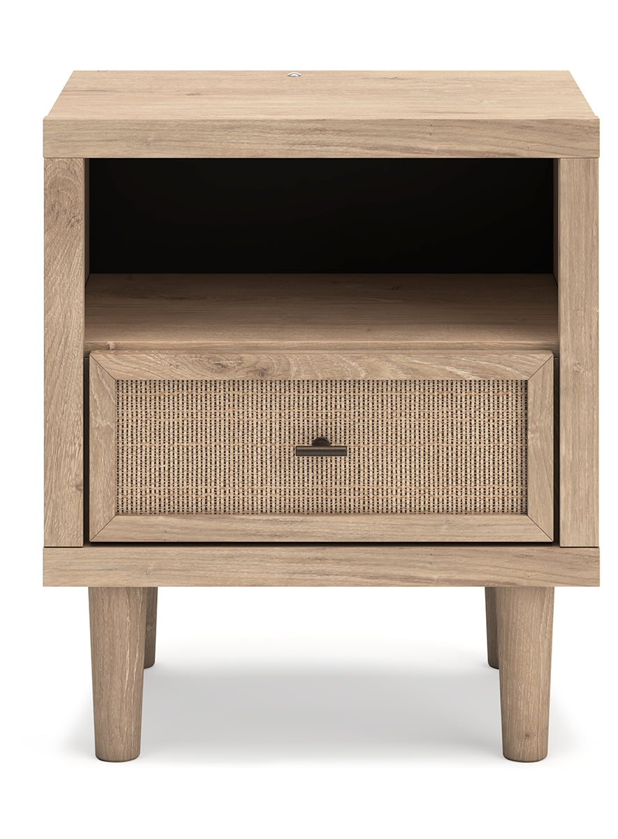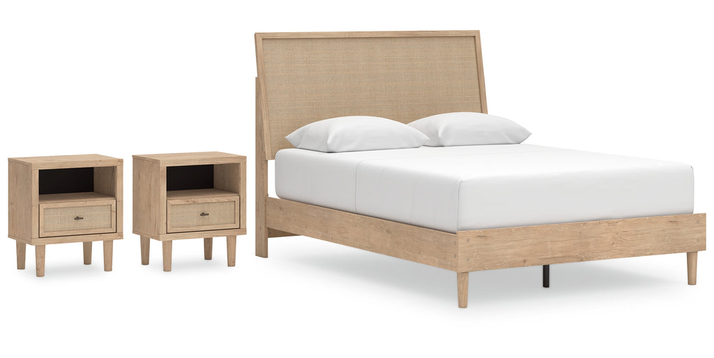 Clean-lined and contemporary—but far from stark—this bedroom package is a fresh style awakening. Pairing a light finish with replicated oak grain and textured beige cane details, its mixed materials bring a naturally versatile vibe to your bedroom. Sleek, simple hardware plays perfectly with the modern aesthetic.