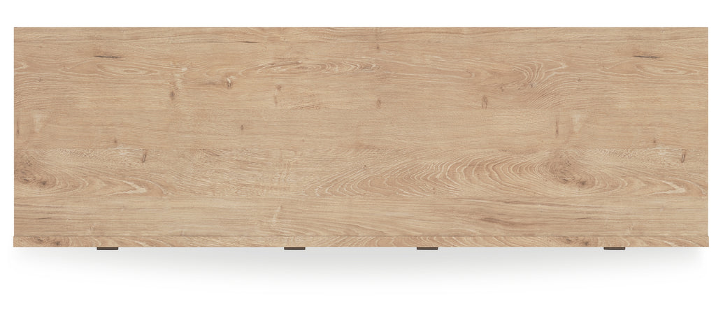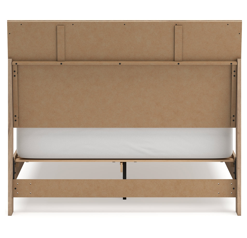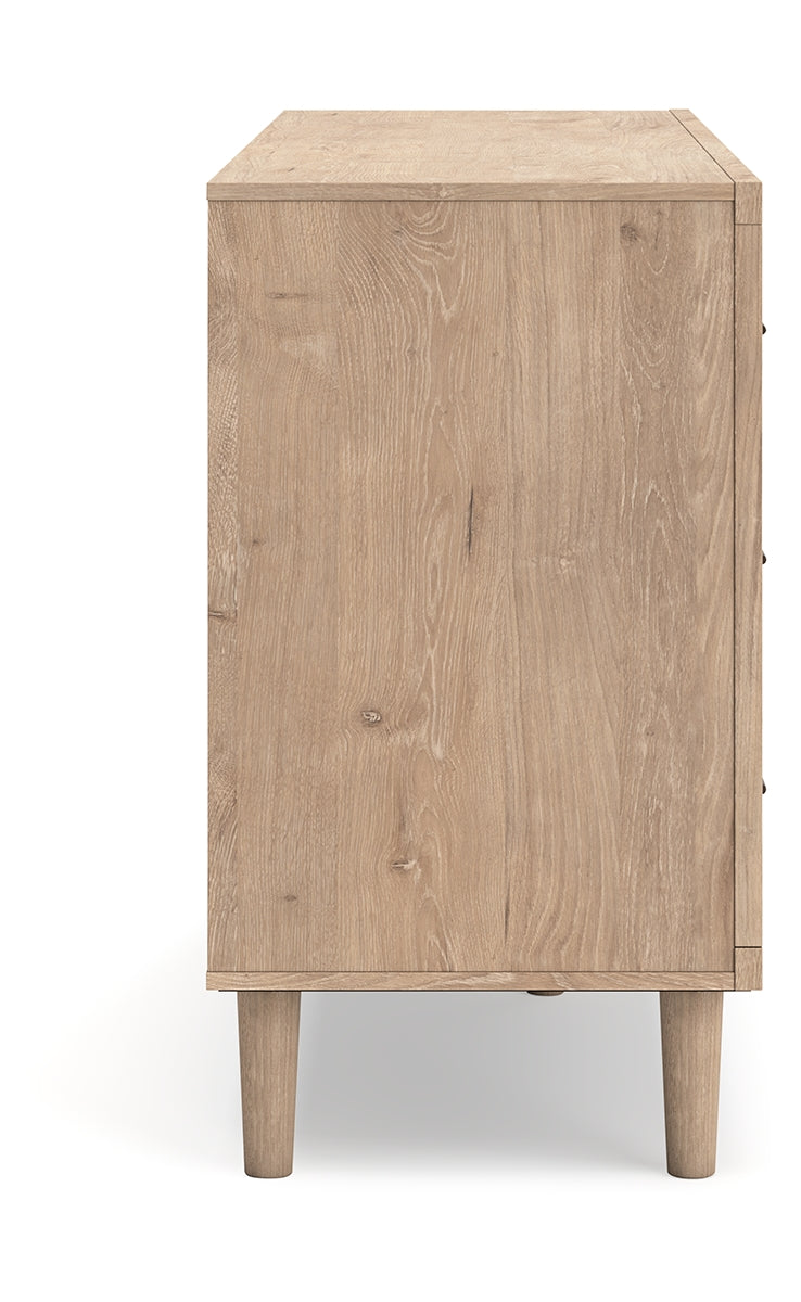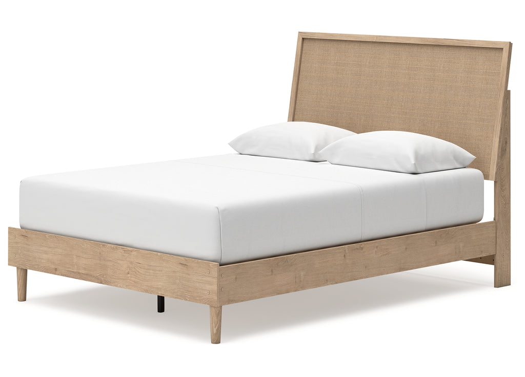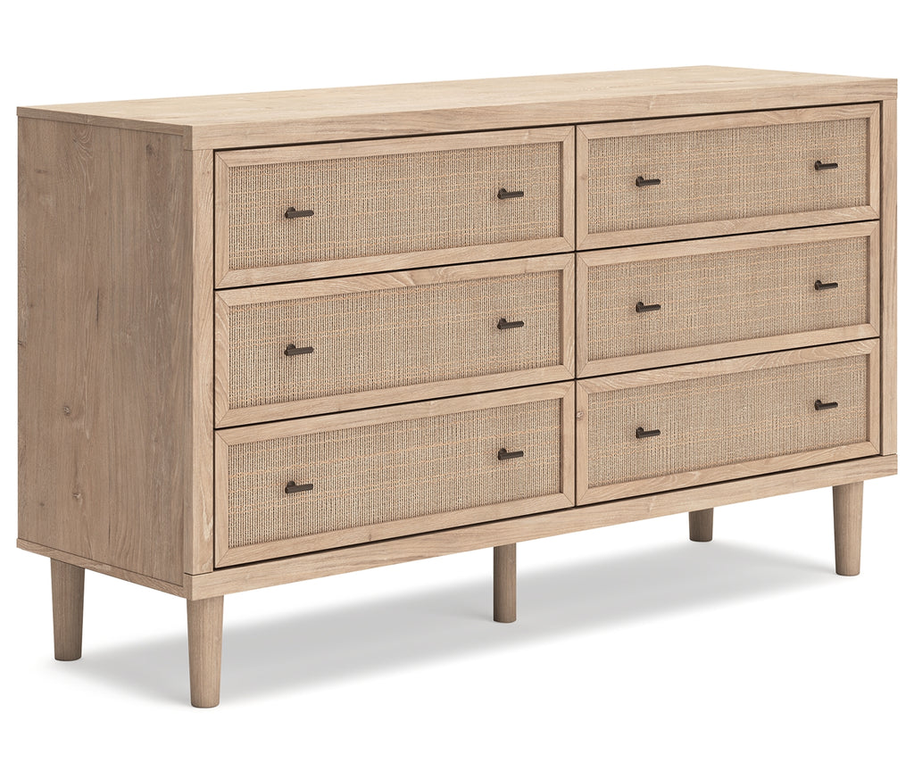 Clean-lined and contemporary—but far from stark—this bedroom package is a fresh style awakening. Pairing a light finish with replicated oak grain and textured beige cane details, its mixed materials bring a naturally versatile vibe to your bedroom. Sleek, simple hardware plays perfectly with the modern aesthetic.