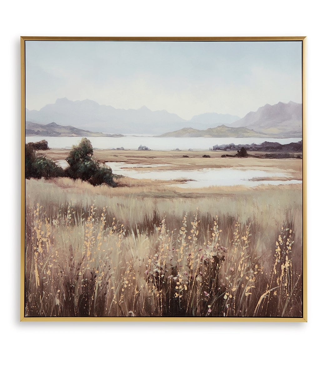 This wall art puts a peaceful spin on hanging decor. Its quiet landscape invites you to a lakeside field, with rolling mountains in the background that bring depth to the design. Hand-painted and gold leaf embellishments make each piece unique.