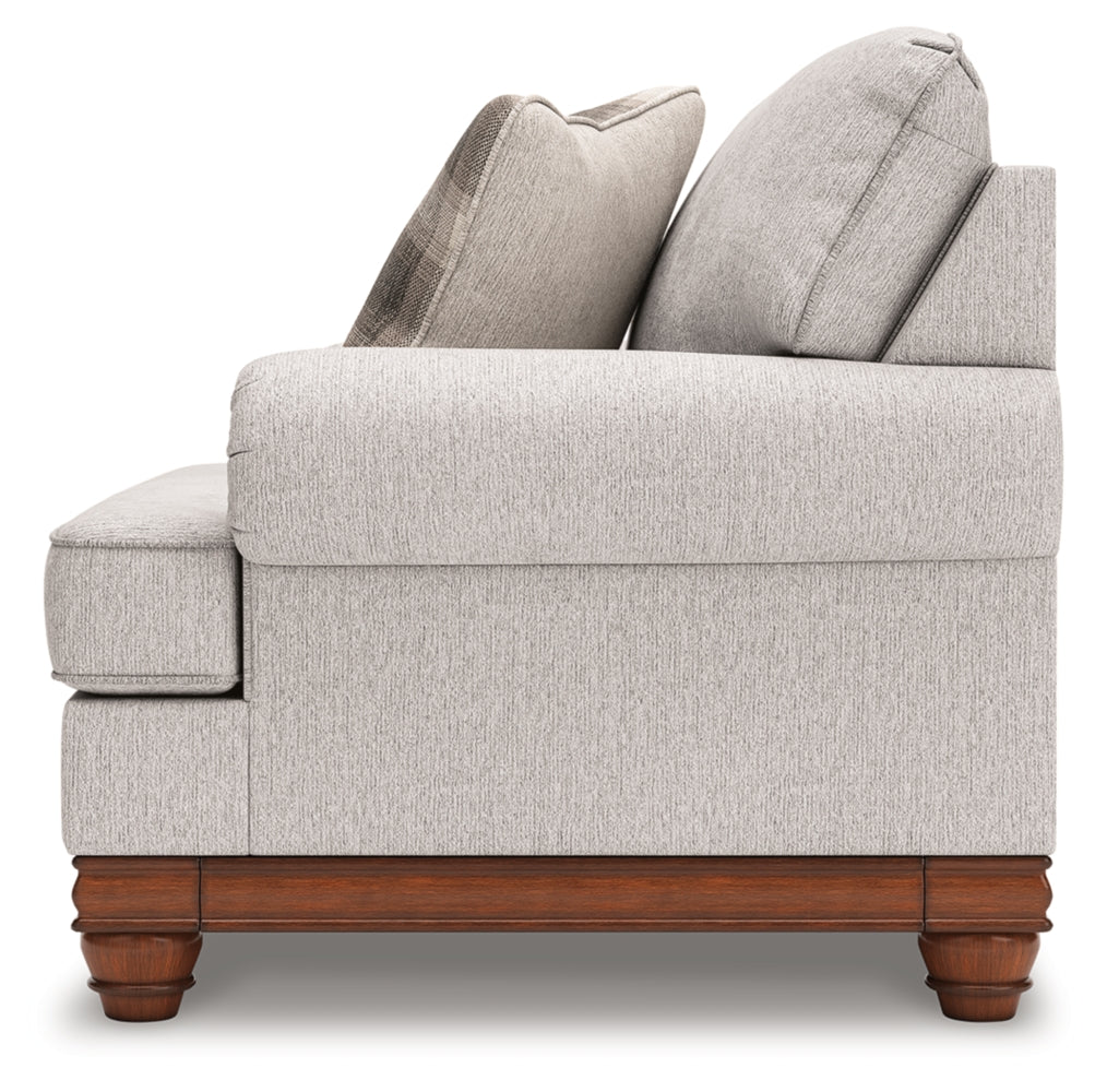 Fresh yet classic. That’s the beauty of this oversized chair. Dressy and also soft to the touch, its organic neutral-toned upholstery is sure to bring a transitional farmhouse aesthetic to your living space. An accent pillow in windowpane plaid infuses a cozy and inviting farmhouse sensibility, while a full wraparound base and decorative turned legs complete the chair's timeless look. It's the perfect place to curl up after a long day.