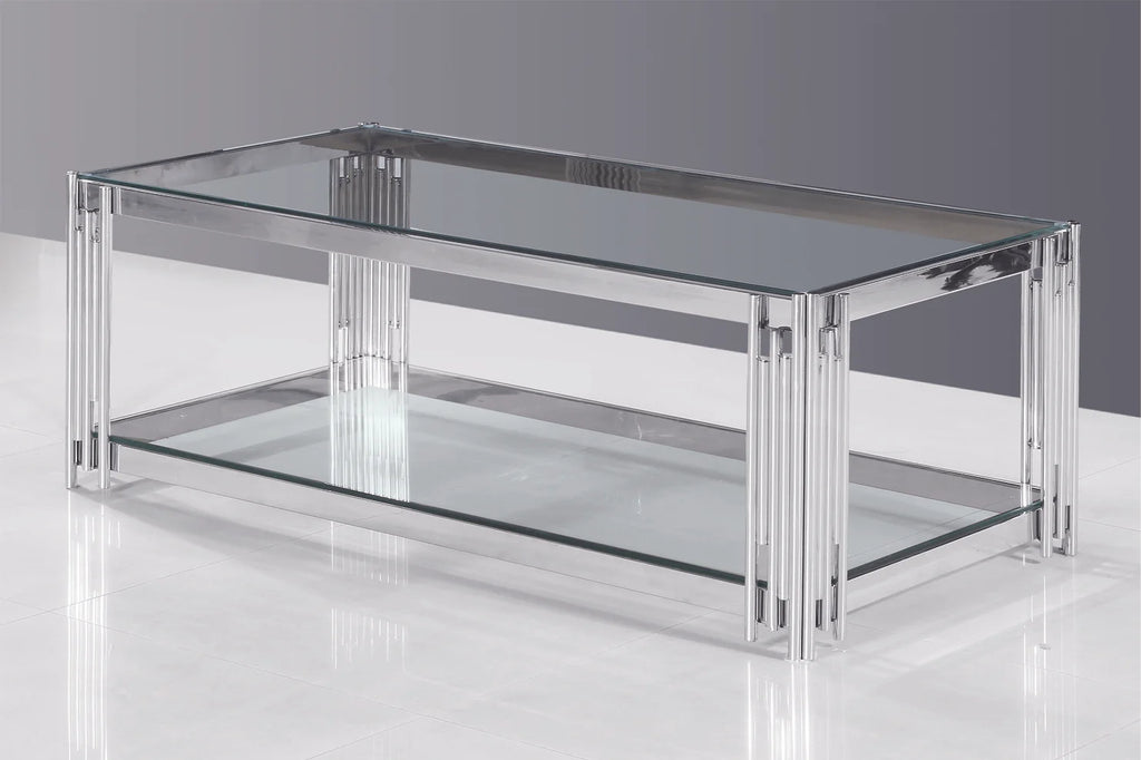 Discover the epitome of modern elegance with our Contemporary Reflections Glass Coffee Table. Designed to be the centrepiece of any living room, this table measures 48"x24"x16", offering ample space for your coffee break essentials or to showcase your favorite art books. The table features a 12mm thick clear glass that promises durability and effortless grace. The minimalist design paired with reflective columns adds a touch of contemporary sophistication to any décor.