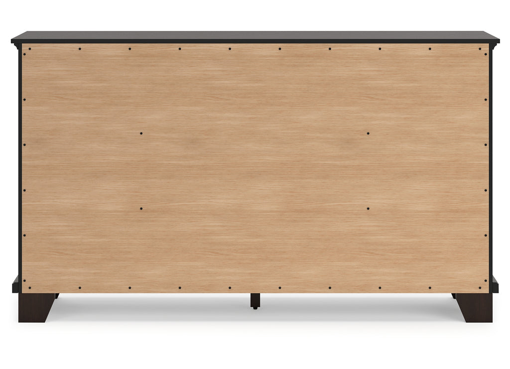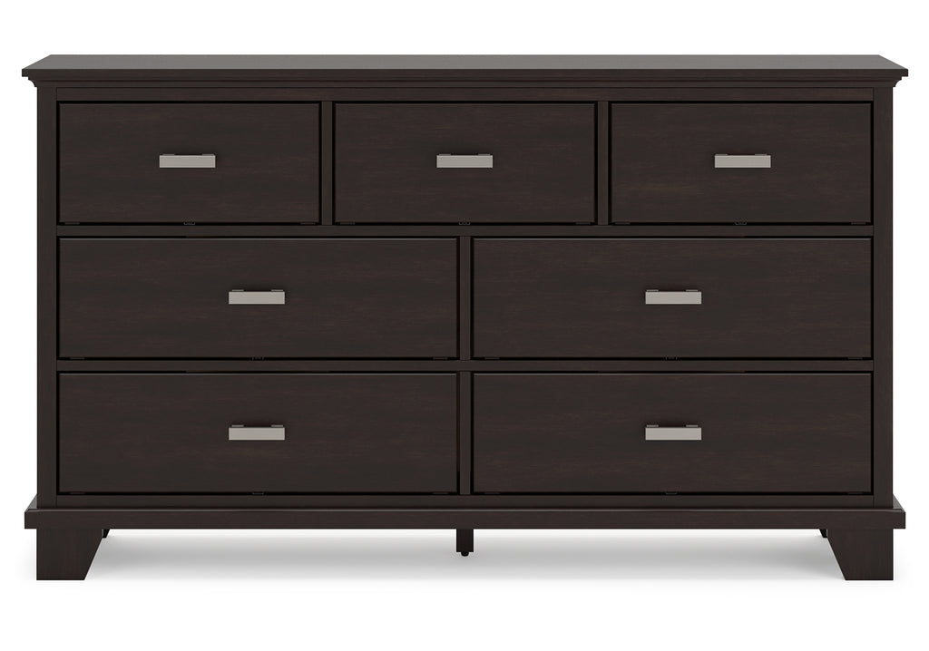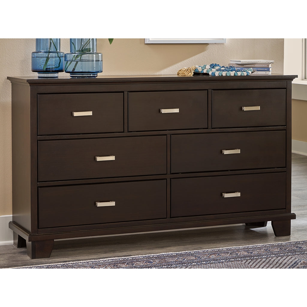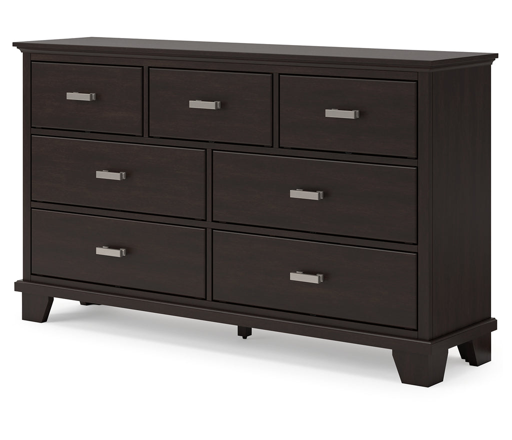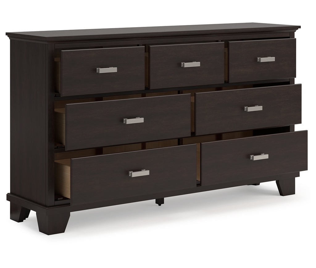 Feast your eyes on this richly versatile dresser. Its traditional-inspired dark brown finish effortlessly blends with contemporary bright nickel-tone pulls to create a stunning look that's not too stuffy or too trendy. Spacious drawers offer plenty of storage for your wardrobe and spare bed linens.