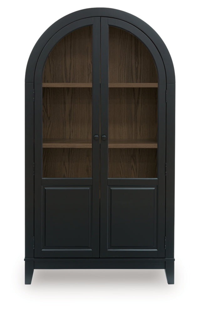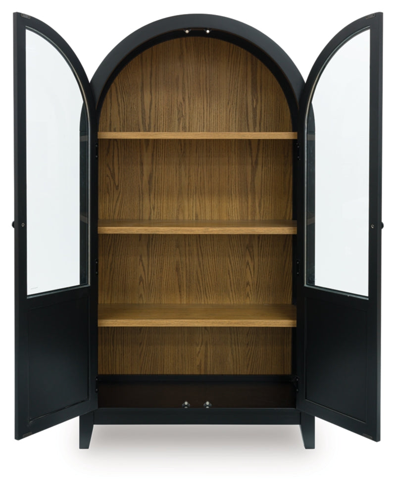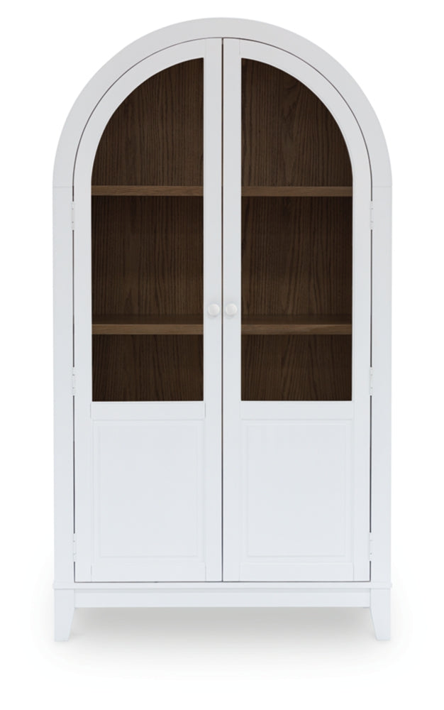 This accent cabinet is a stunning marriage of architectural intrigue and sophisticated storage. Its glass-paneled doors and natural wood tone create an inviting warmth well-suited to transitional spaces. Ideal for showcasing fine china or storing everyday essentials, this versatile piece proves that practical storage can be utterly beautiful.
