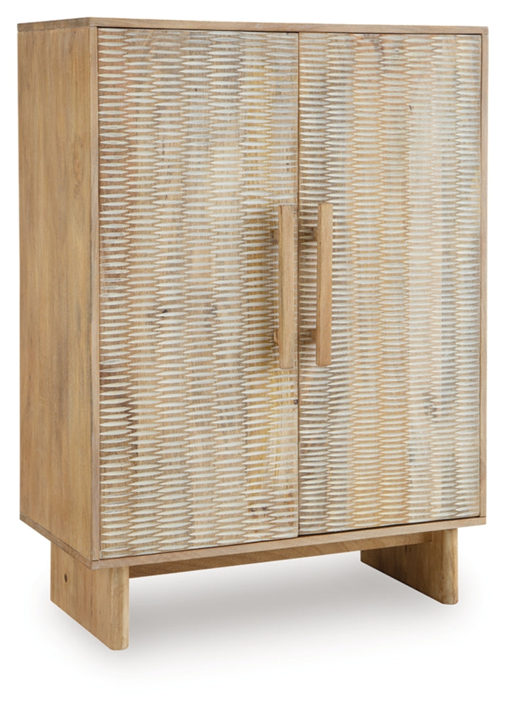 If it’s coastal chic or cottage quaint style you long for, this delightful accent cabinet is sure to satisfy. Doors with a carved scoop design in a whitewash and natural finish convey an easy-breezy sensibility, perfect for a relaxed vibe. A light wire-brushed effect enhances the wood grain. Two shelves cater to your out-of-sight storage needs. What a charming complement to your casual-chic decor.