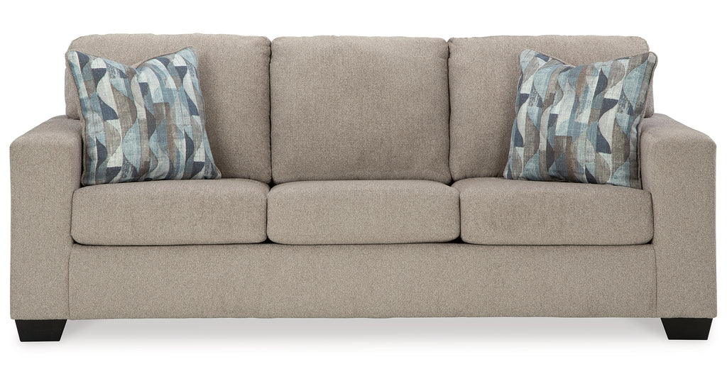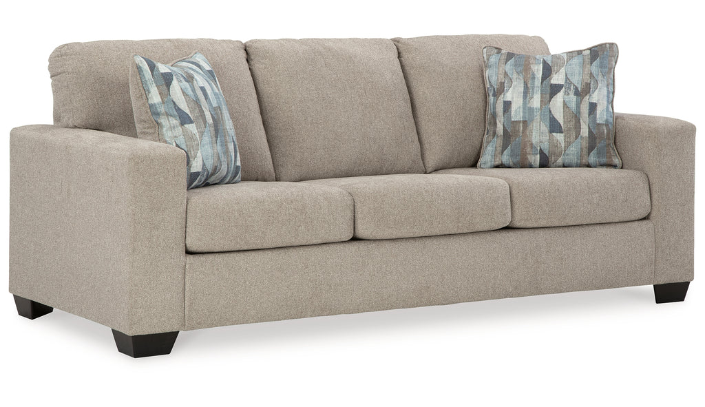 You’re in for a neat treat with this sofa. Its comfy seats are covered in soft, textural upholstery, and the wide track arms are eager to support your quest for total relaxation. Distressed abstract toss pillows bring a fresh breath of contemporary style while accentuating the sofa's color.