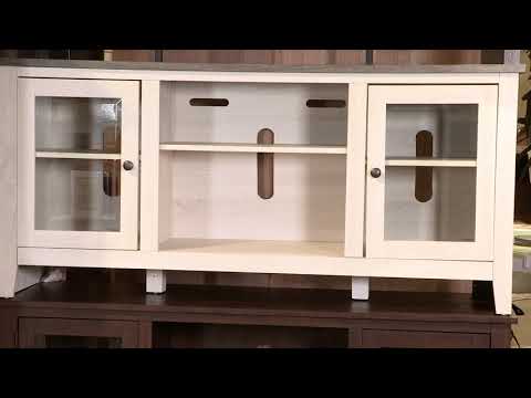 With its two-tone finish and minimalist charm, this TV stand with electric fireplace insert is right in tune with your relaxed approach to high style. Beautifully made to accommodate your media equipment, it’s well equipped with adjustable shelving, cutouts for wire management and a pair of glass-front doors that enhance the clean-lined aesthetic. The look is ideal for modern farmhouse and contemporary settings. Adding that much more show-stopping style, the electric fireplace insert operates with or without heat and includes a six-level temperature setting, a remote control and an overheating control for added safety. It comes with faux glass crystals and natural stones, so you can customize the look of the flame bed.