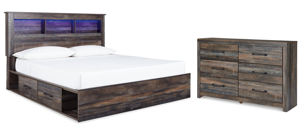 This king-size bookcase bed with storage and dresser is a refined take on barn board beauty. Its complex, replicated wood grain showcases hints of burnt orange and teal tones for a sense of weatherworn authenticity. Three open cubbies lined with a dimming LED light strip keep bedtime reads top of mind while underneath the bed four smooth-gliding drawers and four open cubbies accommodate casually cool storage bins. The dresser with six smooth-gliding drawers lined with faux linen laminate and industrial dark-tone hardware complete this rustic and industrial style bedroom. Mattress and foundation/box spring available, sold separately.