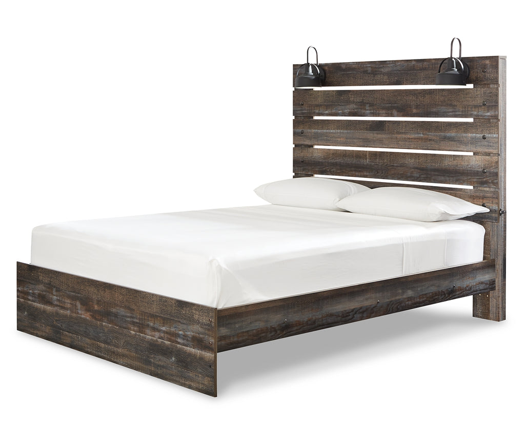 This queen-size panel bed and dresser is a refined take on barn board beauty. Its complex, replicated wood grain showcases hints of burnt orange and teal tones for a sense of weatherworn authenticity. Love to read in bed? You’re sure to find the pair of retro-chic light sconces and USB plug-ins on the open-slat style headboard such a bright idea. The dresser with six smooth-gliding drawers lined with faux linen laminate and industrial dark-tone hardware complete this rustic and industrial style bedroom. Mattress and foundation/box spring available, sold separately.