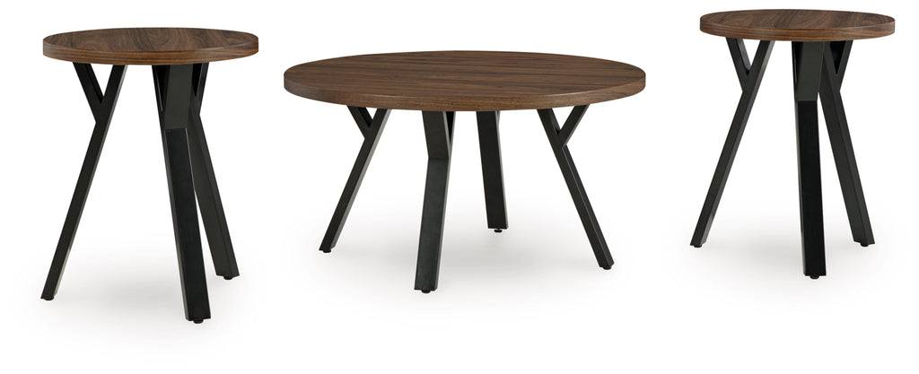 Take casual up a notch with this table set. Thick tabletops captivate with a reclaimed walnut wood look, providing a cool contrast to modern canted steel legs in a matte black finish. Round tables make the most of smaller rooms and are ideal for modular seating—so consider bunching the end tables with the coffee table for a trend-right statement.
