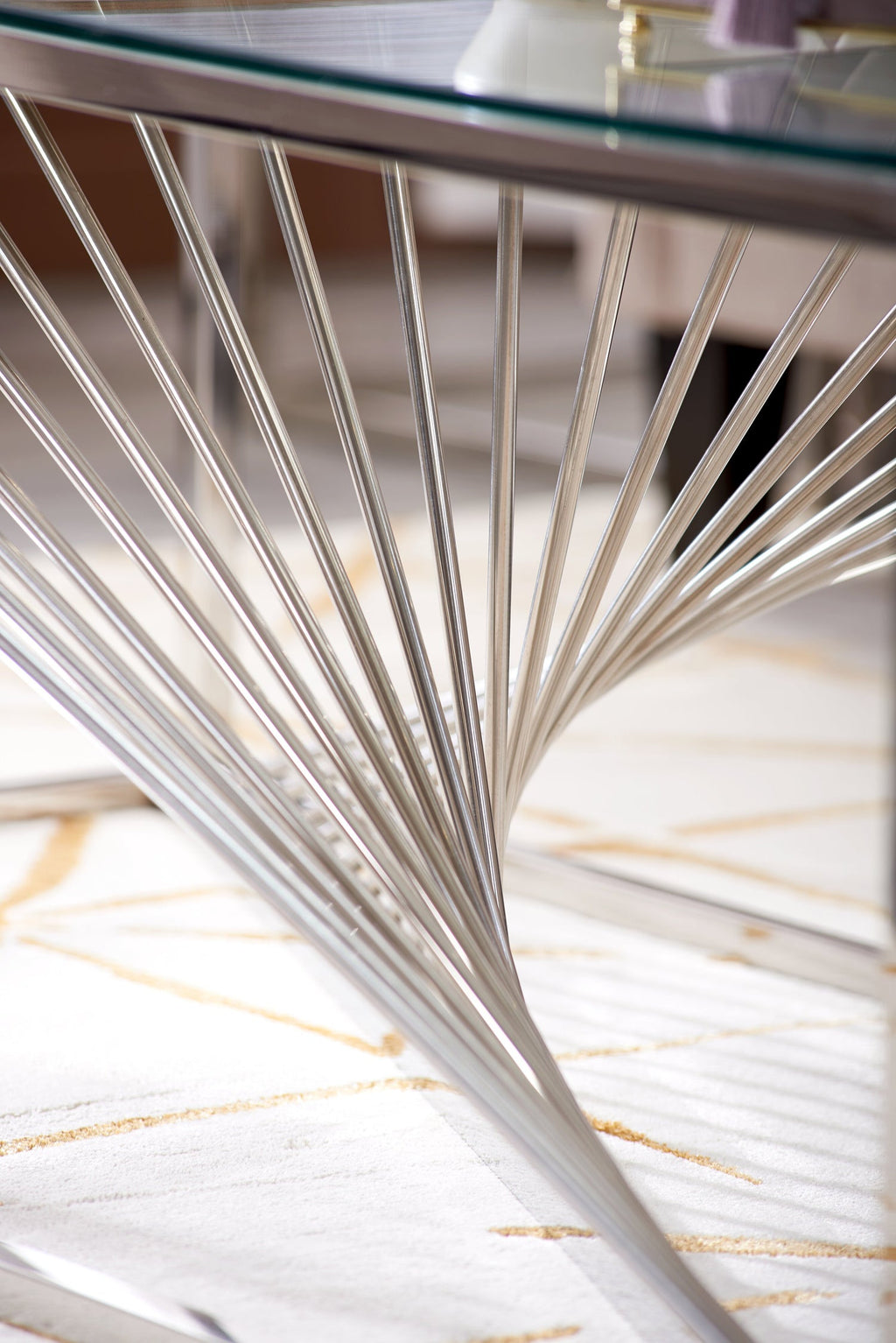- Chrome-finished, sculptural base for a modern aesthetic