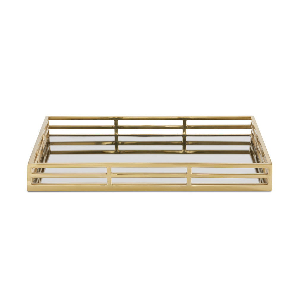 Unveil a touch of elegance and functionality with our Elegant Reflections tray, a sophisticated accessory that combines utility with beauty. The tray's black stained mirror surface is complemented by opulent gold edges, offering a luxurious look that is perfect for serving, displaying, or organizing your treasured items. Measuring 55 x 37.5 x 7 cm, this sizable tray is as practical as it is stylish, making it an ideal addition to any room in your home.