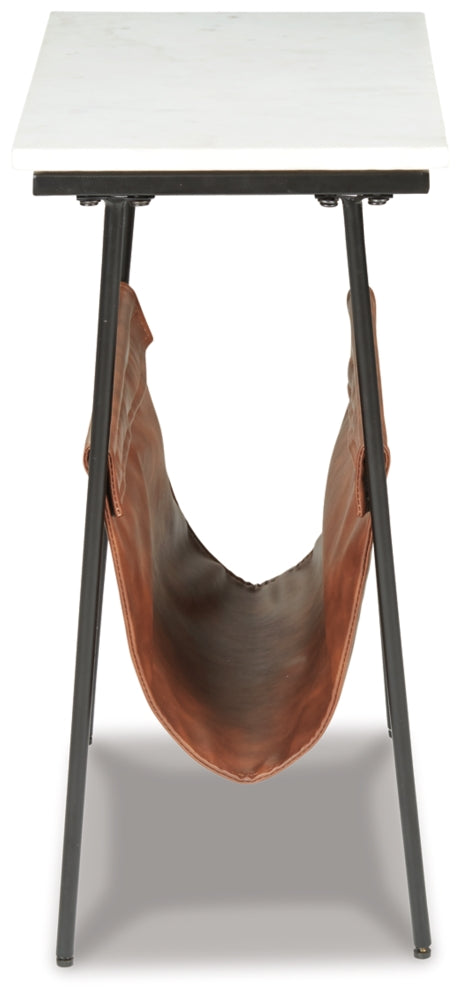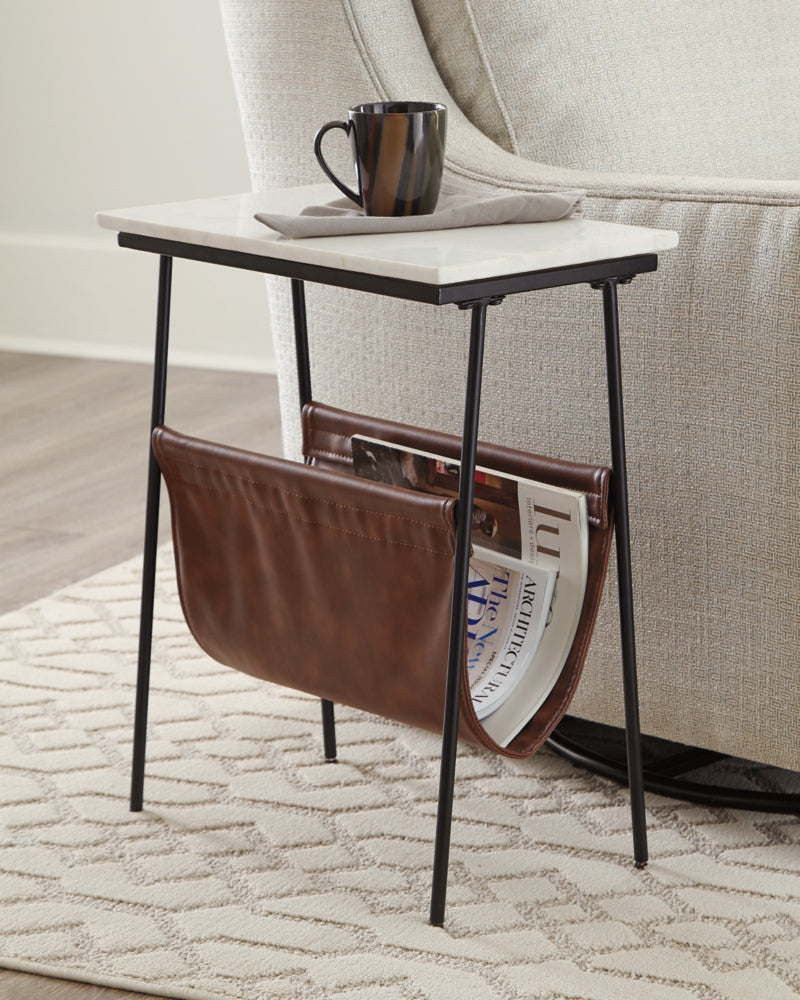 With its mixed media design, this accent table with magazine holder is what’s new—and what’s you. A fusion of black metal, white marble and brown faux leather creates a contemporary aesthetic that’s the genuine article.