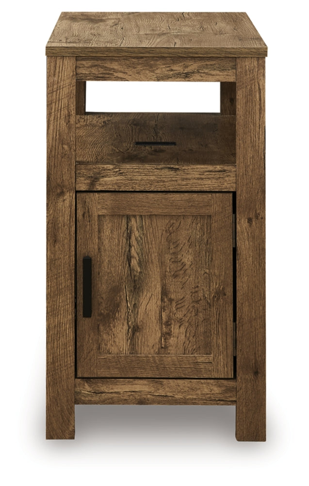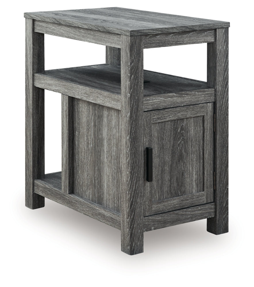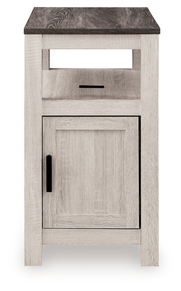 Embrace simply stylish sofa-side function with this chairside end table. Keep entertainment essentials like remotes, coasters and more close with the handy storage cabinet. Battery running low? Built-in USB ports keep easy charging at your fingertips. And with the table's replicated weathered gray finish, it has the versatility to pair with aesthetics from casual to farmhouse.