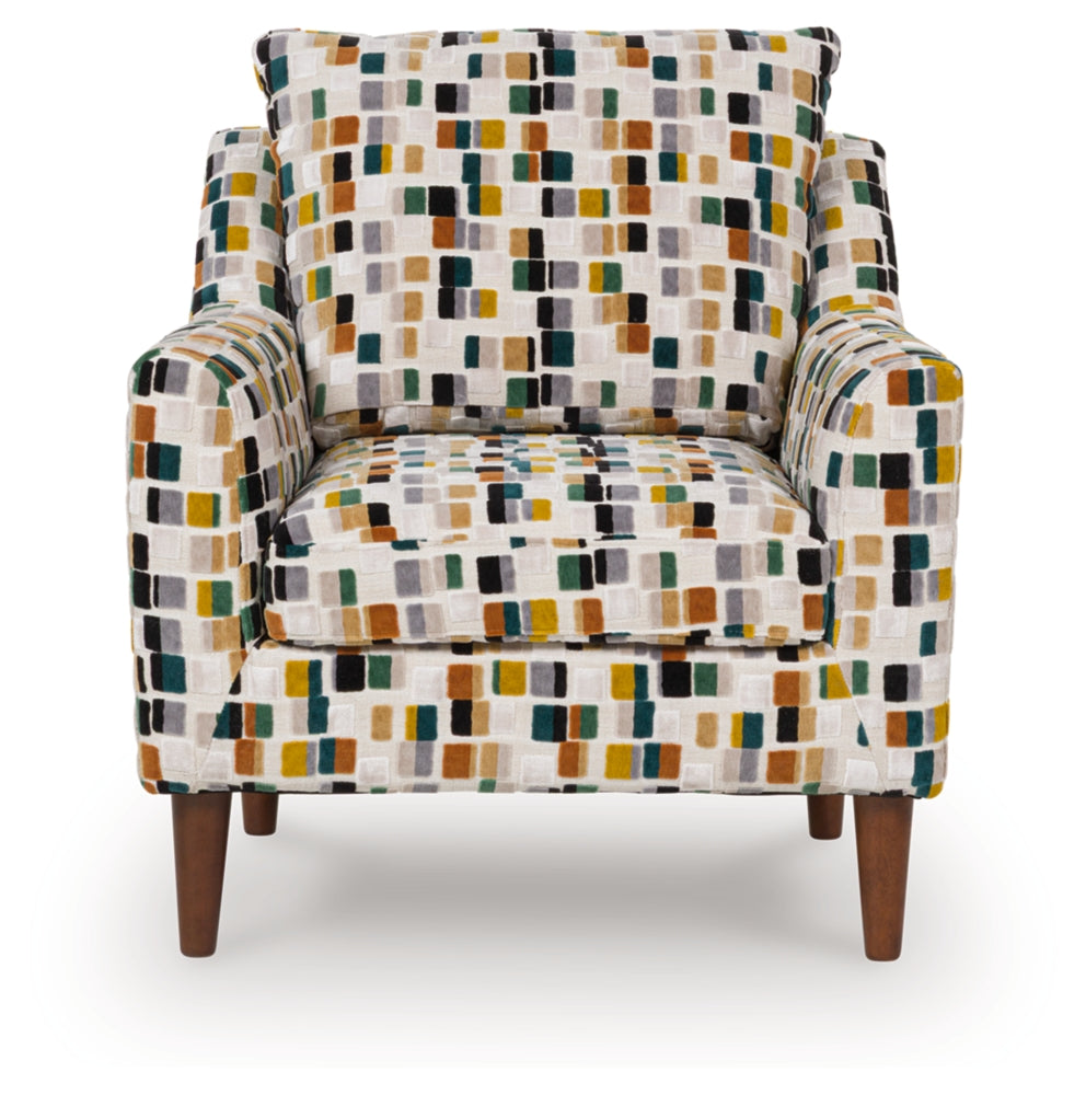 Looking for a statement piece that's both stylish and comfortable? This accent chair delivers with its vibrant multicolor block pattern and plush upholstery. The classic shelter arm styling adds a touch of timeless elegance, while the chair's overall design brings a pop of personality to any room.